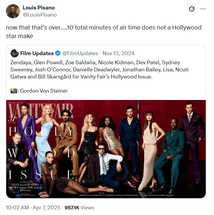 Bên dưới bài đăng của Louis Pisano, không ít fan đã bảo vệ Lisa. Họ so sánh Lisa cùng nhiều người gương mặt nổi bật khác như Zendaya, Anthony Hopkins. Lấy ví dụ, Zendaya cũng có tổng thời lượng lên hình là 10 phút trong phim Dune , nhưng vẫn tham gia tour quảng bá phim vì cô nổi tiếng, có thể kéo được người xem và đó là điều các nhà sản xuất mong muốn. Anthony Hopkins thậm chí giành giải Oscar với 16 phút diễn xuất. “Đến cuối cùng thì diễn xuất tốt vẫn là diễn xuất tốt” – fan Lisa phản bác.