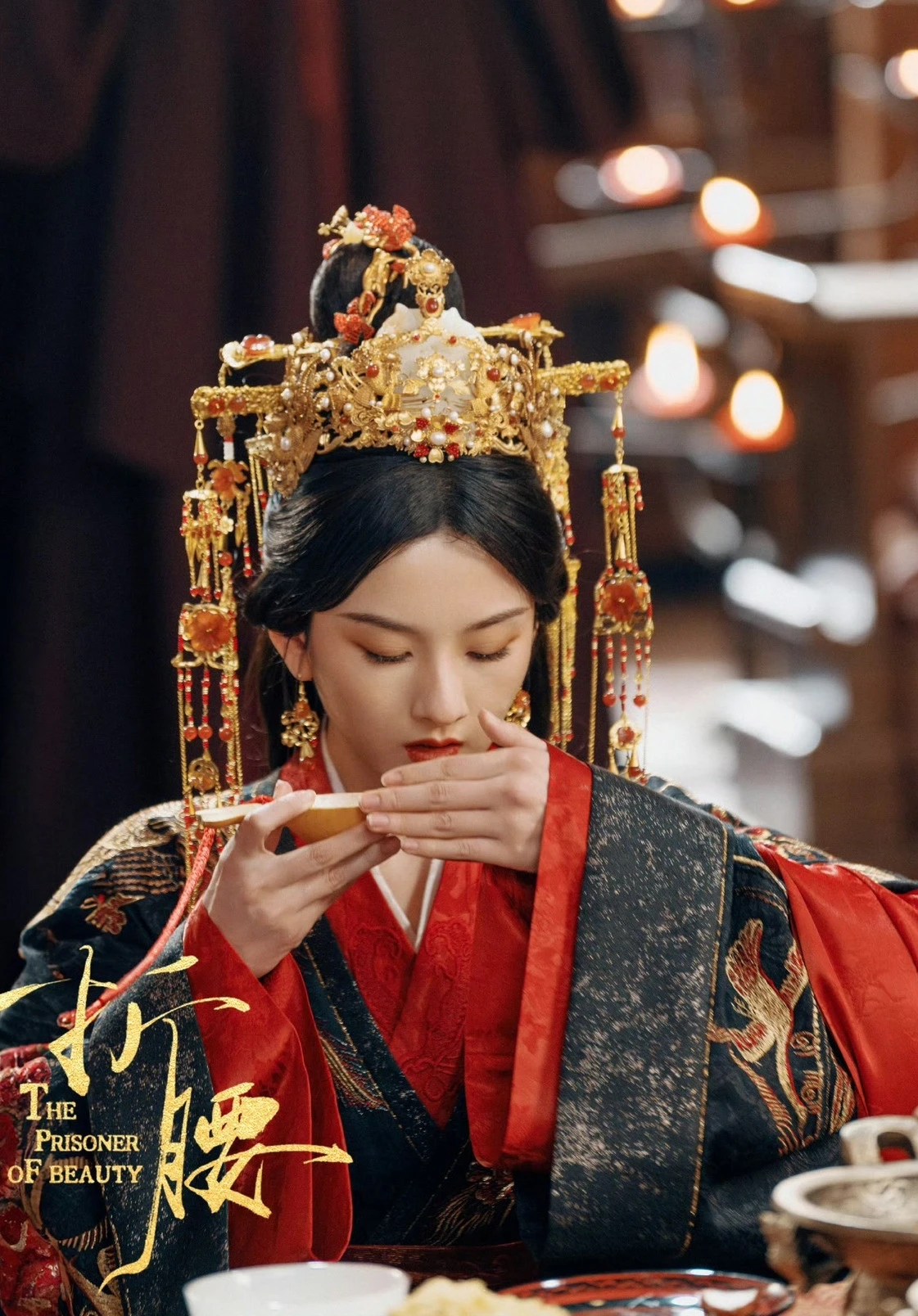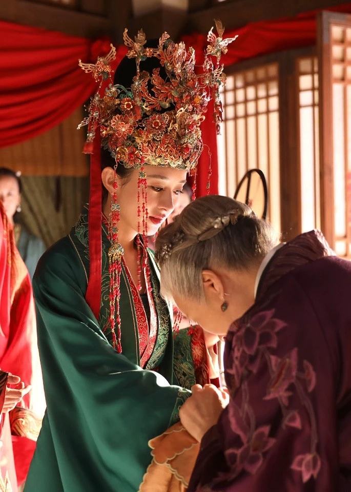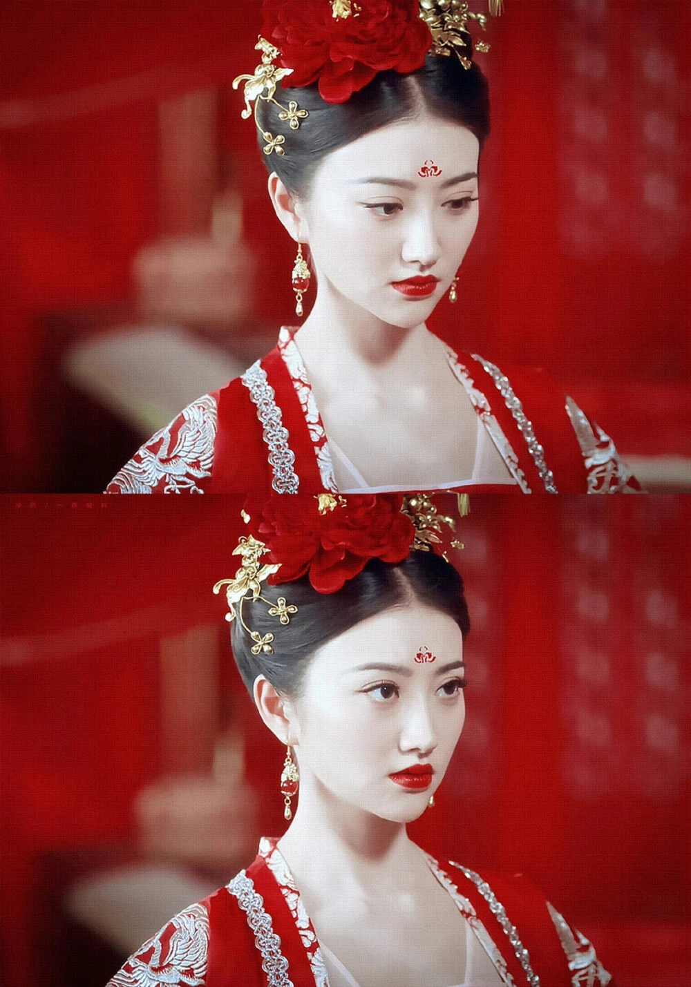 Mặc dù đã phát sóng từ lâu, tạo hình đại hôn trong bộ phim Đại Đường Vinh Diệu vẫn để lại ấn tượng sâu sắc trong lòng khán giả. Trong phim, nhân vật Thẩm Trân Châu do Cảnh Điềm thủ vai xuất hiện lộng lẫy trong bộ áo cưới đỏ rực rỡ, tôn lên vẻ đẹp kiều diễm vốn có của cô. Thay vì đội mũ miện cầu kỳ, Cảnh Điềm sử dụng những bông hoa đỏ lớn cùng với hoa điền (hoa trang trí trên trán), tạo nên một phong cách đậm chất mỹ nhân thời Đường. Thiết kế trang phục này không chỉ làm nổi bật vẻ sang trọng, quý phái mà còn phù hợp với bối cảnh lịch sử của bộ phim.