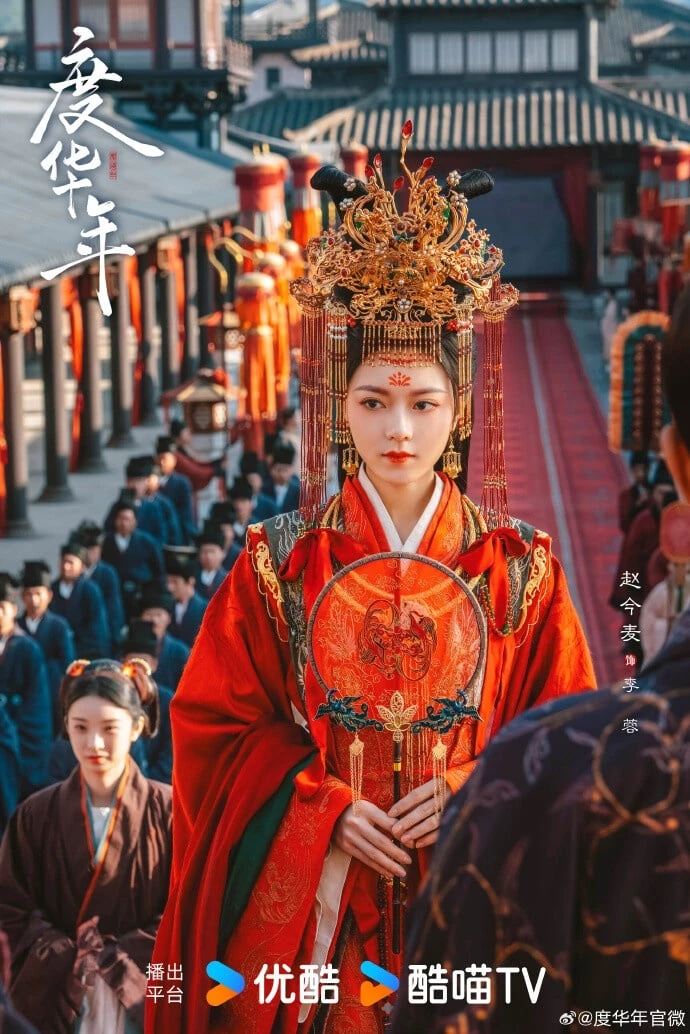 Trong bộ phim Độ Hoa Niên, nhân vật Lý Nhung do Triệu Kim Mạch thủ vai là một trưởng công chúa, kết hôn với phò mã Bùi Văn Tuyên (Trương Lăng Hách). Với địa vị cao quý của cả hai, lễ đại hôn được tái hiện một cách vô cùng long trọng và xa hoa. Tạo hình hỷ phục của Triệu Kim Mạch là một trong những điểm nhấn ấn tượng nhất. Bộ trang phục được thiết kế vô cùng lộng lẫy, từ màu sắc, họa tiết cho đến phụ kiện đều toát lên vẻ quyền quý, cao sang của một công chúa.