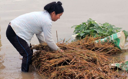 Người dân vớt vát từng bó lúa dưới nước lũ
