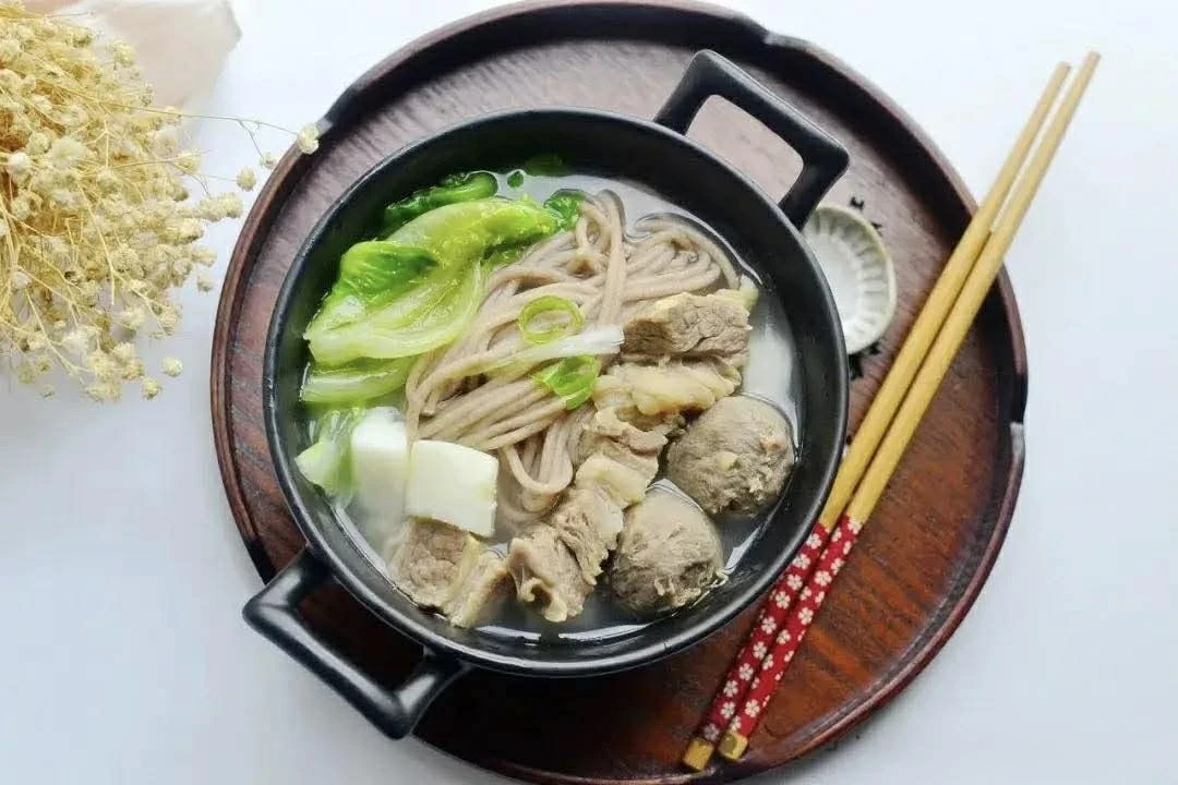 Nguyên liệu: 200g thịt ức bò, lượng củ mài vừa đủ, 1 nắm mì sợi nâu, lượng rau xà lách vừa phải, 1 thìa canh tinh chất cốt gà, vài lát gừng, hành lá, vài viên thịt bò viên.