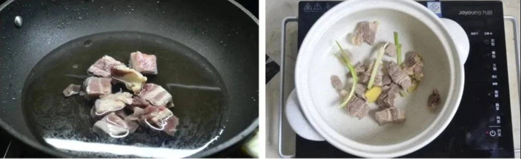 Bước 1: Thịt ức bò bạn rửa sạch sau đó thái thành miếng to. Cho thịt ức bò vào nồi nước, đun sôi và chần qua, vớt ra rồi rửa sạch. Sau đó cho thịt ức bò đã chần vào nồi sứ cùng với vài lát gừng cùng 2-3 gốc hành. Thêm một lượng nước lọc vừa đủ, đun sôi, sau đó ninh ở lửa vừa nhỏ trong khoảng 40 phút.