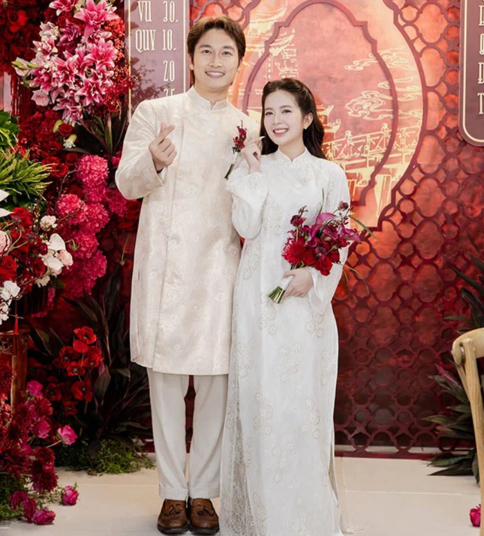 Tại lễ ăn hỏi, cả hai diện áo dài trắng – be đồng điệu. Không gian nhà gái được thiết kế với hình ảnh cầu Thê Húc, đền Ngọc Sơn, biểu tượng của sự bình yên và gắn kết. Nhà trai lại đậm chất quan họ Kinh Bắc với nón quai thao, hoa sen cổ. Từng chi tiết trang trí đều mang tính điện ảnh, như một đại cảnh cưới được dàn dựng công phu.