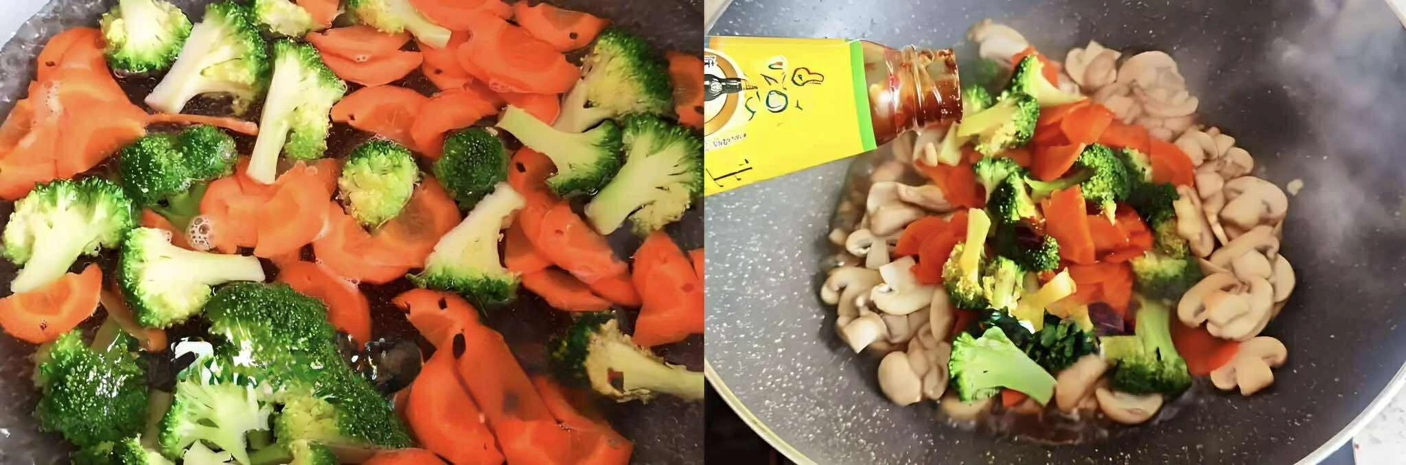 Bước 1: Rửa bông cải xanh dưới vòi nước sau đó cắt thành từng nhánh nhỏ. Tiếp theo bạn chuẩn bị một chậu nước có pha chút muối và bột mì, thả bông cải xanh vào, ngâm khoảng 15 phút rồi rửa lại thật sạch. Cà rốt gọt bỏ vỏ rồi rửa sạch sau đó thái lát mỏng. Nấm mỡ rửa sạch và thái lát. Tỏi băm nhỏ. Đun sôi một nồi nước rồi cho bông cải xanh cùng cà rốt vào chần trong khoảng 1 phút. Vớt ra và để ráo. Việc chần này giúp các nguyên liệu giữ màu sắc và độ giòn thích hợp.