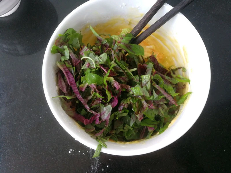 Bước 2: Rau dền sau khi rửa sạch, để ráo thì thái nhỏ. Tiếp đó bạn cho rau dền đã thái vào bát bột vừa trộn, thêm chút nước. Trộn đều hỗn hợp bột và rau dền đỏ. Sau đó thêm dầu hào và tiếp tục trộn đều rồi để hỗn hợp bột nghỉ trong 2 phút.