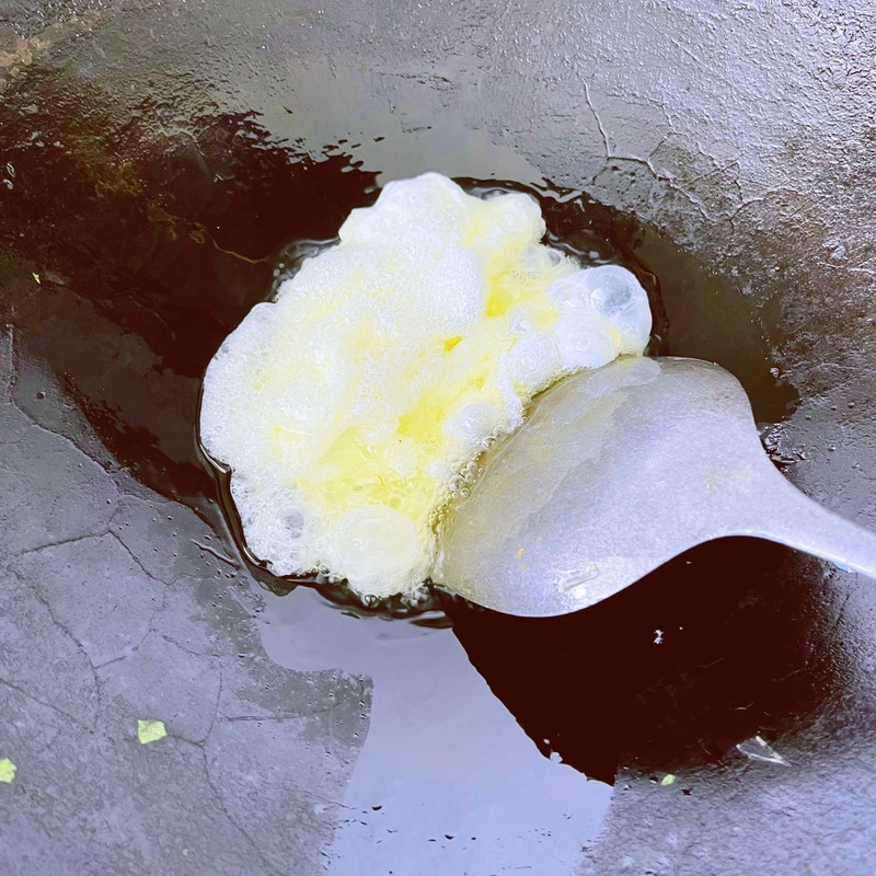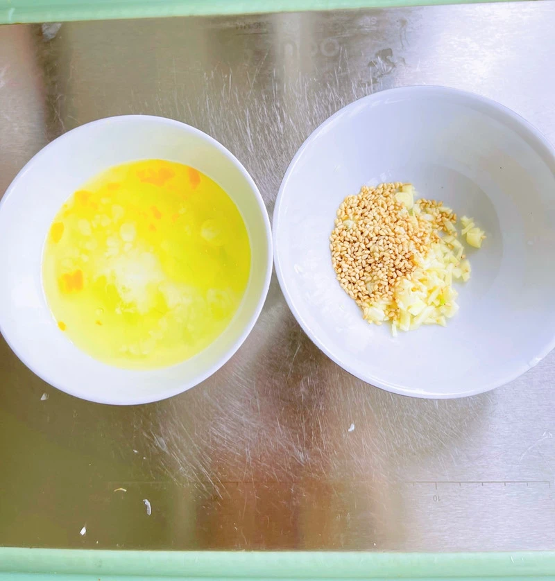 Bước 2: Đập trứng gà tách riêng lòng đỏ và lấy lòng trắng. Cho tỏi băm vào một bát nhỏ cùng vừng trắng đã rang. Sau đó bạn cho nước tương cùng dầu hào vào, khuấy đều để được phần nước sốt.