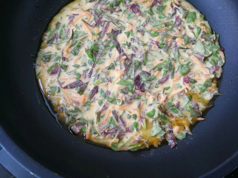 2 quả trứng gà, 30g cà rốt bào sợi nhỏ, 50g lá rau dền đỏ, 60g bột mì, 3g muối, 1 thìa canh dầu hào, lượng nước vừa phải, lượng dầu mè thích hợp.