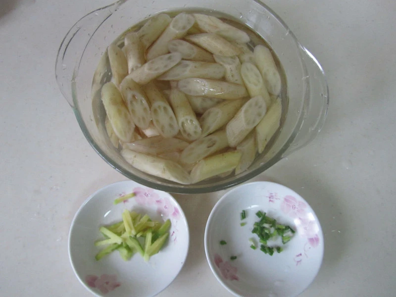 250g ngó sen, 2 cây hành lá, 2 lát gừng, lượng gia vị thích hợp, 2 thìa canh giấm, lượng dầu ăn vừa phải.