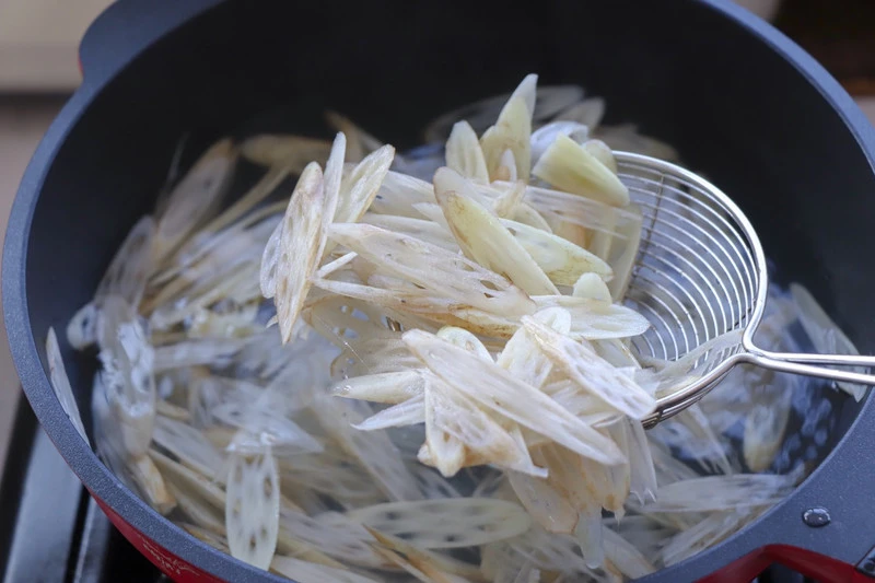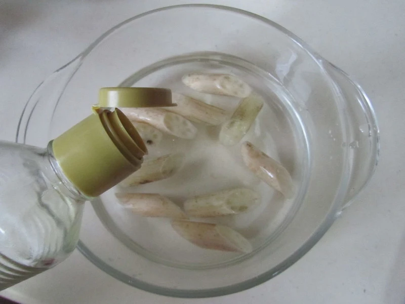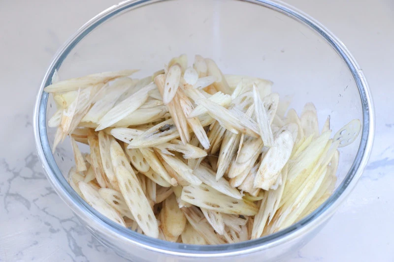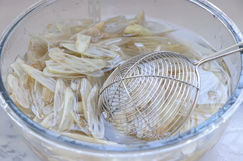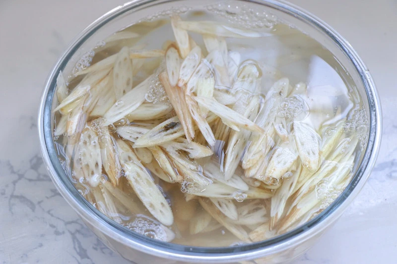 1. Ngâm ngó sen vào nước chanh pha loãng khoảng 15 - 20 phút để tránh bị thâm, sau đó vớt ra để ráo.