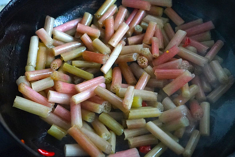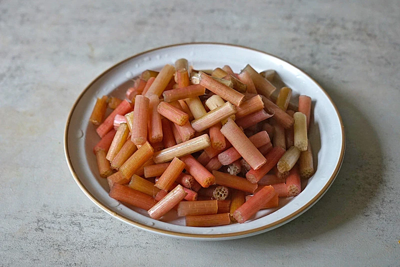 3. Rau tiến vua ngâm nở, rửa sạch và cắt khúc ngắn. Tiếp theo ngâm rau tiến vua trong nước ấm có pha một ít giấm, đường, muối qua đêm.