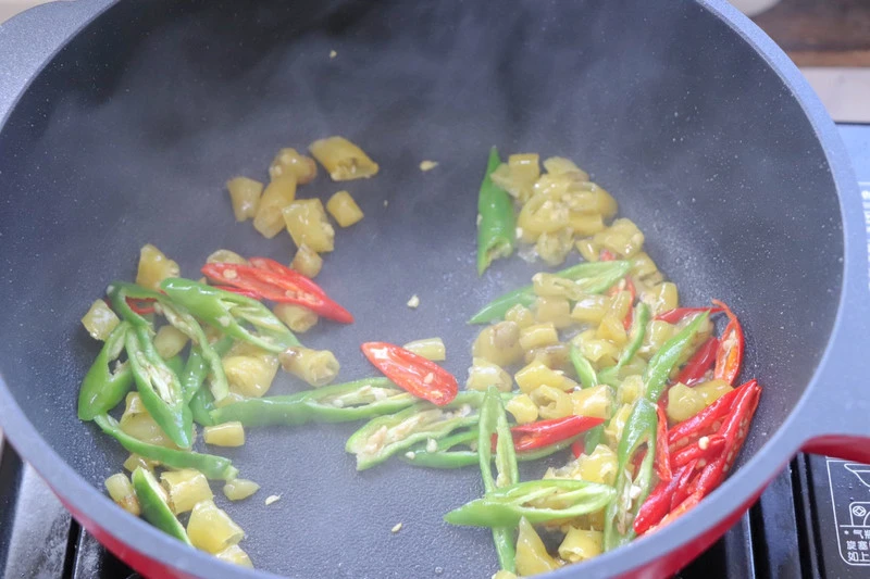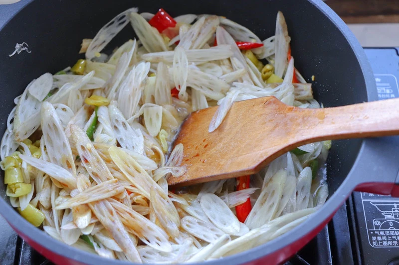 Bước 2: Cho ngó sen đã cắt vào nước sôi, chần qua rồi vớt ra ngay. Ngâm ngó sen vào nước lạnh để giúp chúng giòn hơn. Đun nóng chảo, cho dầu vào và xào các loại ớt khác nhau. Tiếp theo bạn đổ ngó sen vào xào một lúc. Sau đó, thêm gia vị, nước tương và giấm vào rồi xào đều. Khi món ăn hoàn thành, bạn ấy ra đĩa.