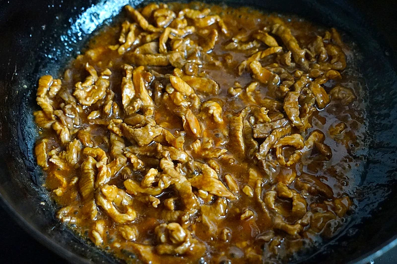 Bước 3: Tiếp đó thêm ớt ngọt, gia vị, tinh chất cốt gà và bột tiêu, xào trên lửa lớn trong 1-2 phút. Cuối cùng, đổ thịt heo đã xào vào và tiếp tục đảo đều trong 1 phút. Sau đó rắc hành lá cắt nhỏ vào và tắt bếp, lấy món ăn ra đĩa.