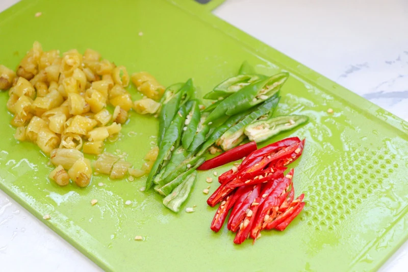 Bước 1: Ngó sen bạn rửa thật sạch, sau đó cắt thành các lát chéo có độ dày vừa phải. Sau đó bạn thả ngó sen vào ngâm trong nước có pha chút muối. Cắt ớt xanh và ớt đỏ thành các miếng nhỏ và để riêng. Ớt ngâm bạn cũng cắt nhỏ.