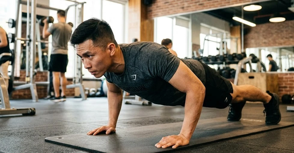 Lưu ý: Người mới có thể bắt đầu với chống đẩy gối hoặc chống đẩy trên ghế để giảm tải.