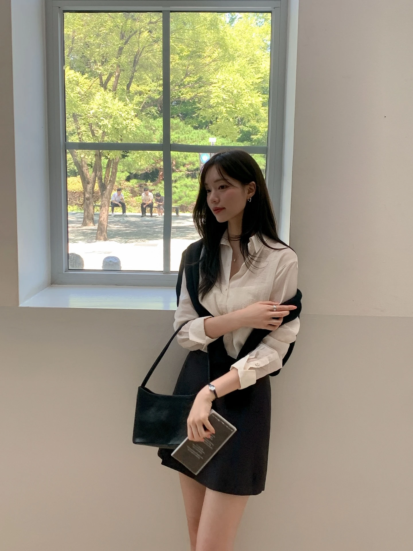 Một chiếc sơ mi trắng cổ điển kết hợp với chân váy ngắn màu trung tính sẽ tạo nên set đồ gọn gàng, dễ mặc. Nếu muốn phá cách, bạn có thể thử sơ mi oversized, sơ vin một nửa hoặc buộc vạt áo để tạo điểm nhấn.