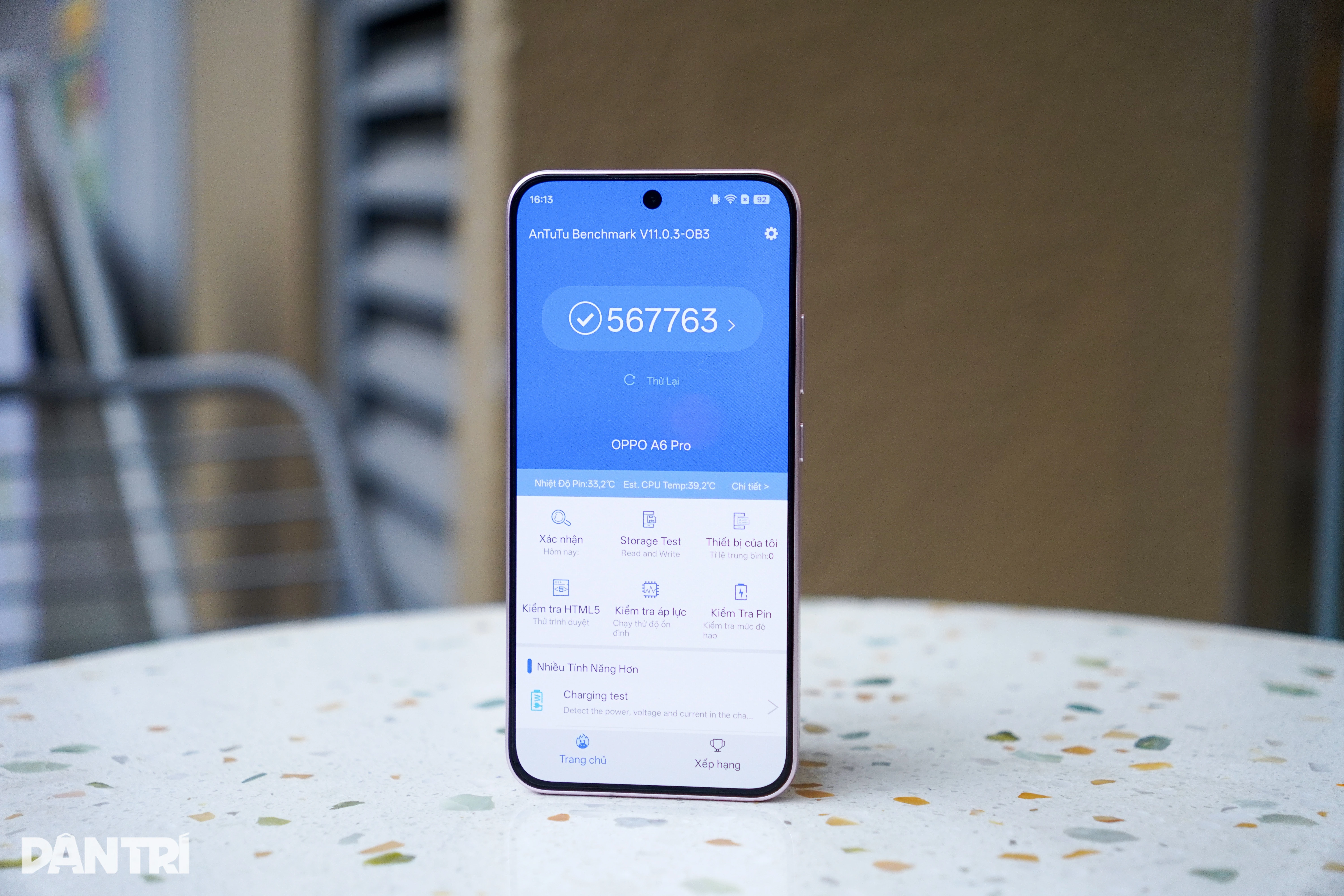 OPPO A6 Pro được trang bị bộ xử lý MediaTek Helio G100, dung lượng RAM 8GB cùng tùy chọn bộ nhớ trong 128/256GB. Đánh giá nhanh thông qua phần mềm chấm điểm hiệu suất Antutu BenchMark, OPPO A6 Pro đạt hơn 567.000 điểm.