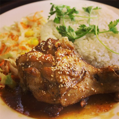 Số 21, ngõ 2, cổng trường Đại học Hà Nội là địa chỉ bán món cơm đùi gà sốt me hấp dẫn. Đây là món cơm trắng được ăn cùng thịt gà mềm thơm và rau trộn. Đơn giản, không cầu kỳ nhưng món này lại có vị lạ miệng. Nước sốt me chua ngọt thấm đẫm từng lớp thịt gà rất đưa cơm. Tuy nhiên bạn nên ăn ngay khi còn nóng , vị chua sẽ nhẹ dịu hơn.