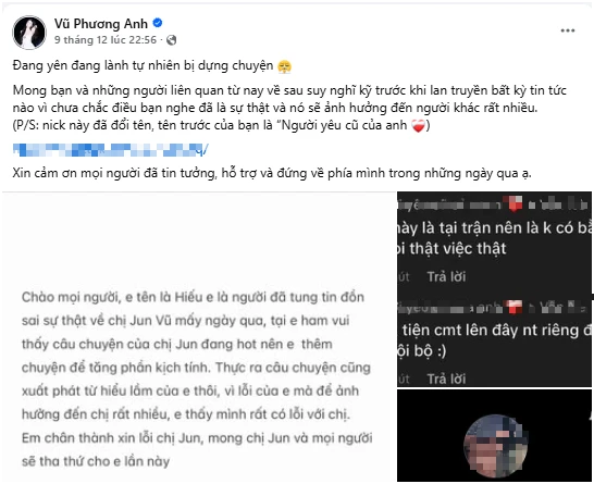 Đến ngày 10/12, Jun Vũ trực tiếp đối chất với người tung tin và nhận được lời xin lỗi. Nữ diễn viên cho biết mọi thứ xuất phát từ hiểu lầm, đồng thời nhấn mạnh việc lan truyền thông tin chưa kiểm chứng có thể gây tổn hại nặng nề đến người trong cuộc.
