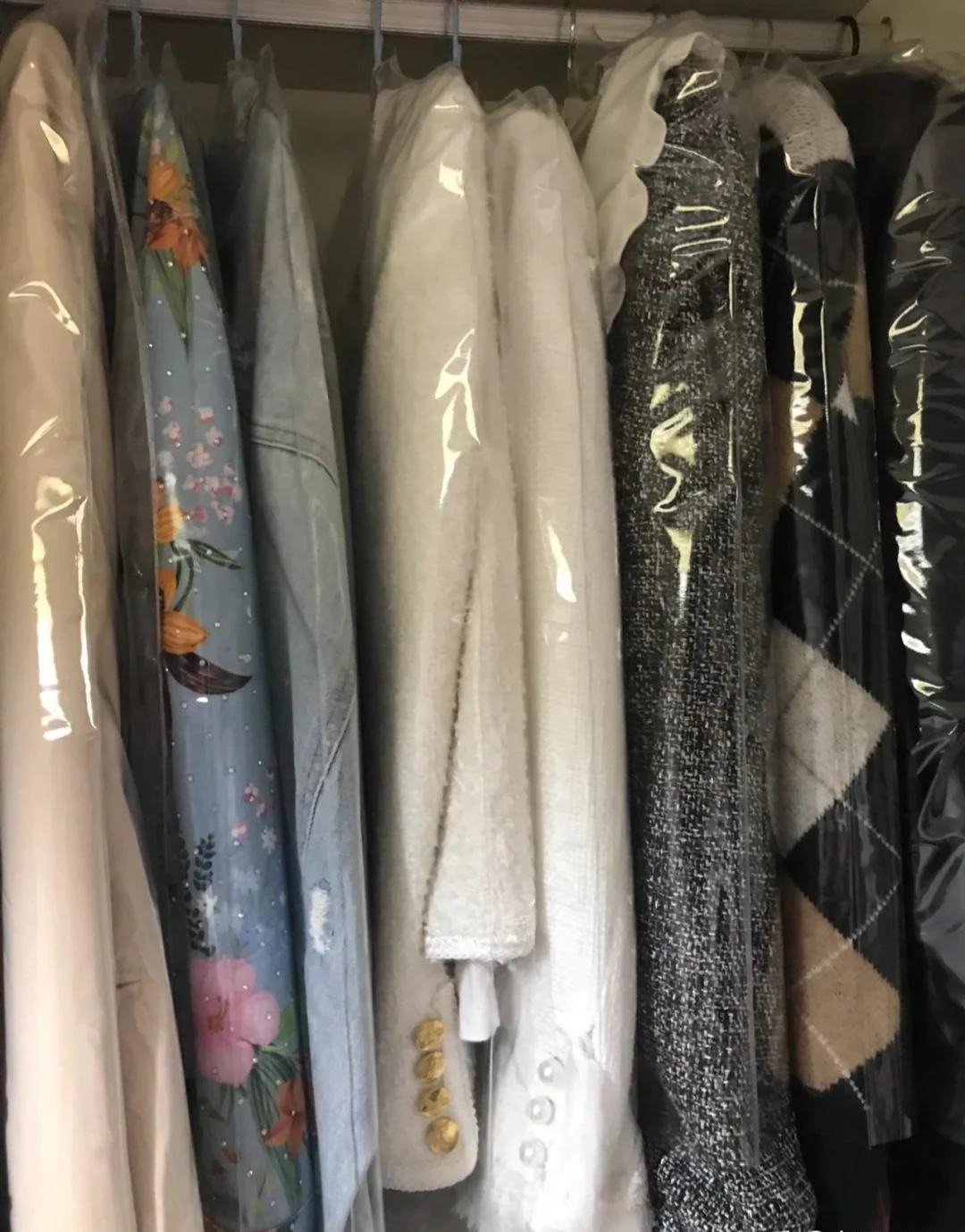 Một cách tiết kiệm hơn là tận dụng túi mua sắm trong suốt từ các cửa hàng quần áo. Chỉ cần cắt một lỗ nhỏ để luồn móc treo, bạn đã có ngay túi bảo vệ quần áo khỏi bụi mà vẫn nhìn rõ bên trong.