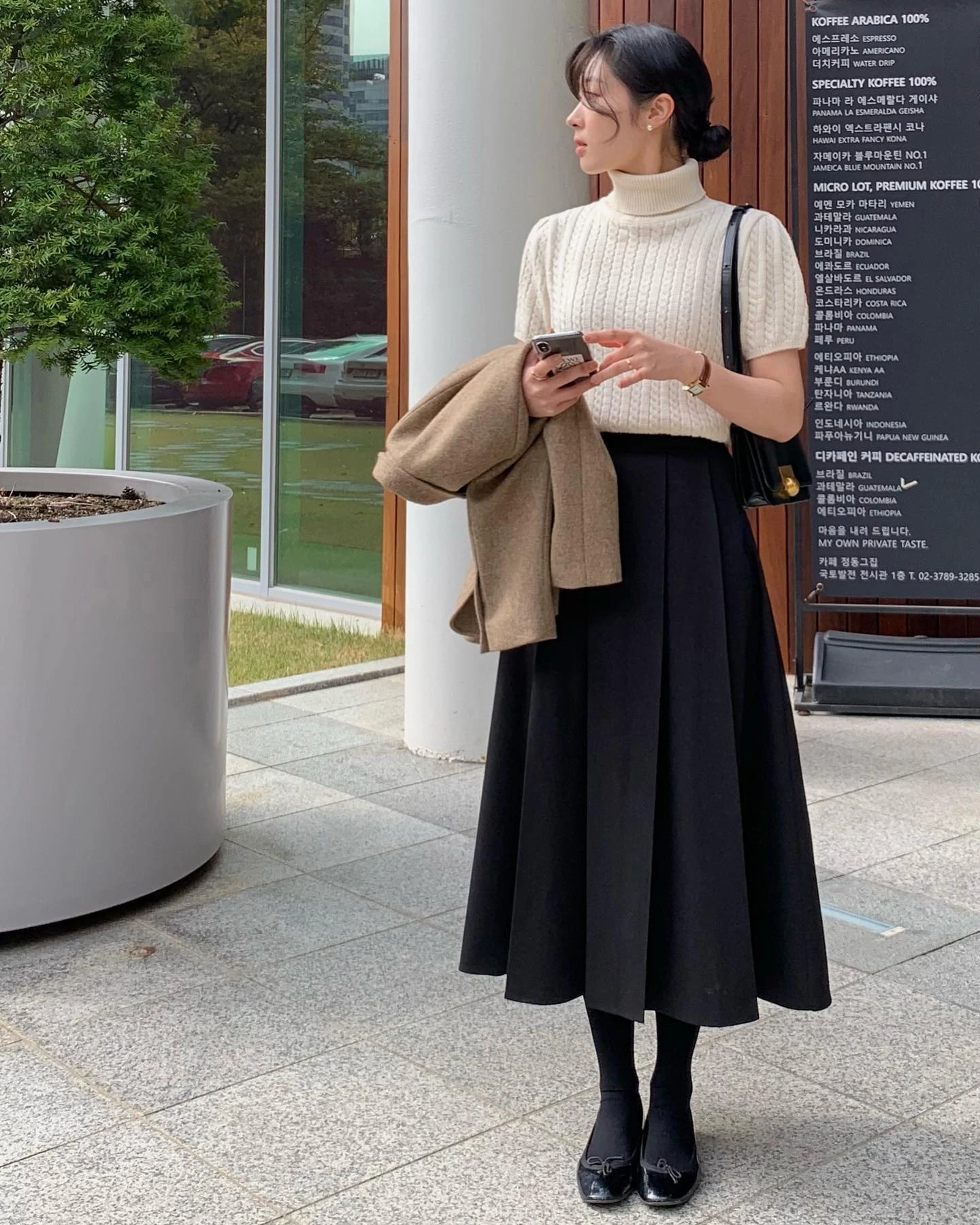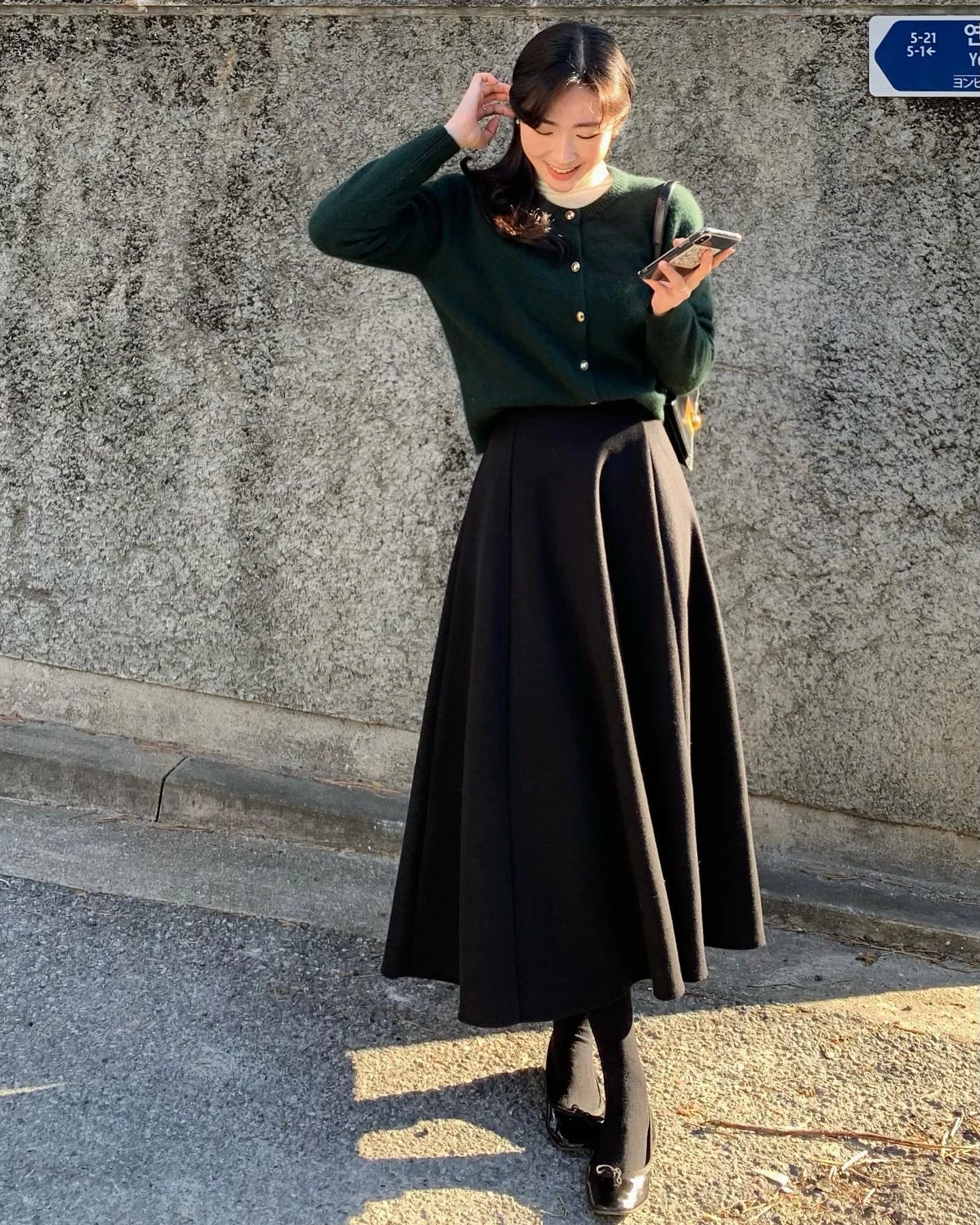 Chân váy chữ A không chỉ là món đồ quen thuộc trong mùa hè mà còn rất thích hợp cho mùa đông, đặc biệt khi kết hợp cùng các item ấm áp khác. Với thiết kế ôm nhẹ ở phần eo và xòe rộng ở dưới, chân váy chữ A giúp bạn tạo ra vẻ ngoài thanh thoát, nữ tính mà vẫn rất thoải mái.