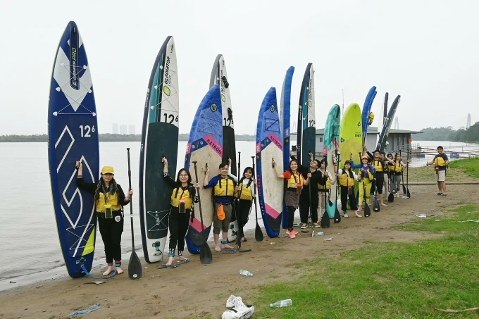 Du khách tham gia tour chèo SUP ở sông Hồng. Ảnh: Umove