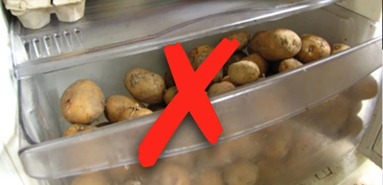 Khoai tây là một trong những loại củ tuyệt đối không nên để trong tủ lạnh. Nhiệt độ thấp khiến tinh bột trong khoai tây chuyển hóa thành đường. Khi đem chế biến, đường kết hợp với nhiệt độ cao sẽ sinh ra hợp chất không có lợi cho sức khỏe , đồng thời làm khoai tây bị sượng và mất vị tự nhiên.