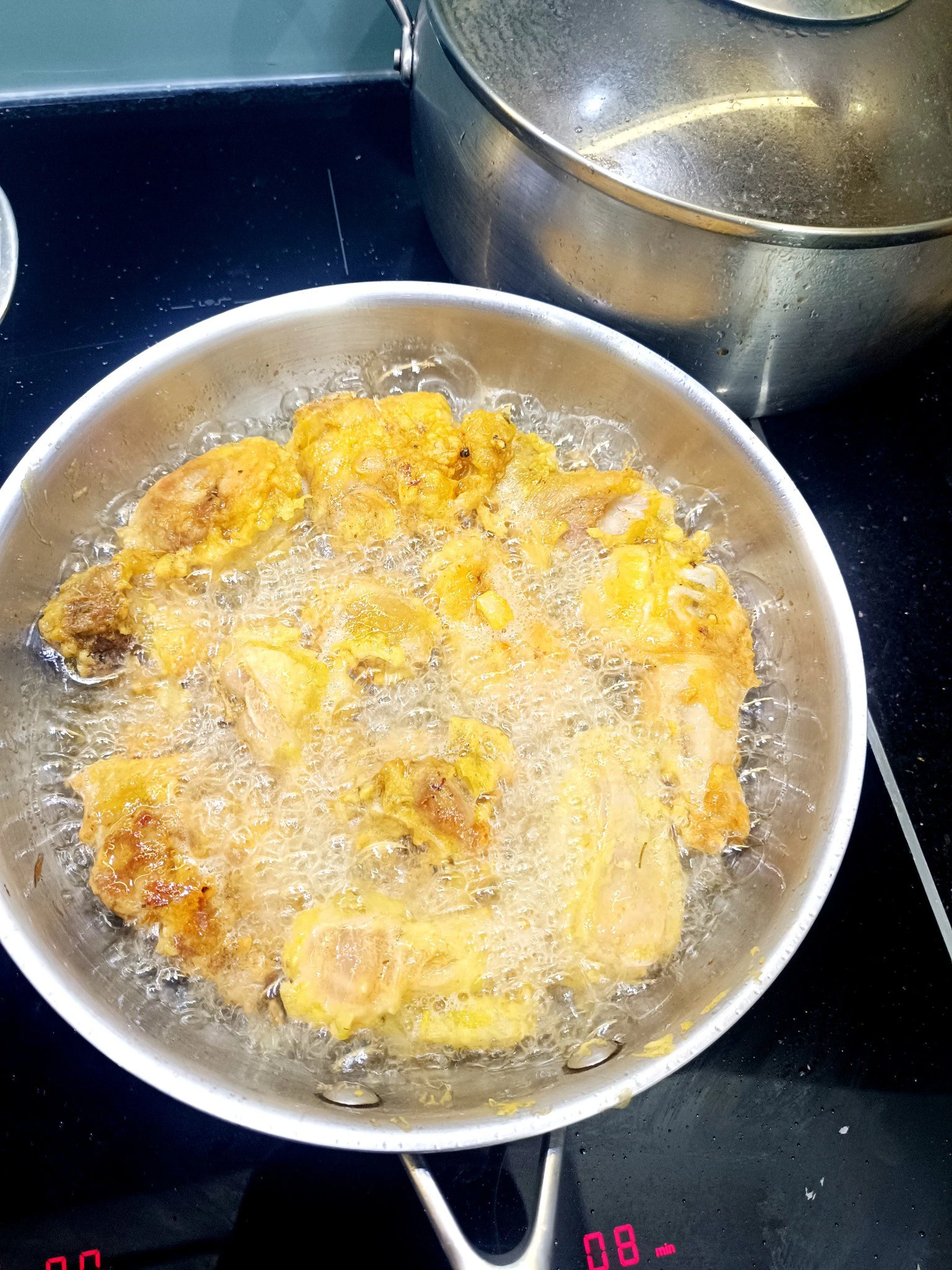 - Lăn gà qua trứng rồi áo đều bằng 1 lớp mỏng bột năng/bột chiên giòn.