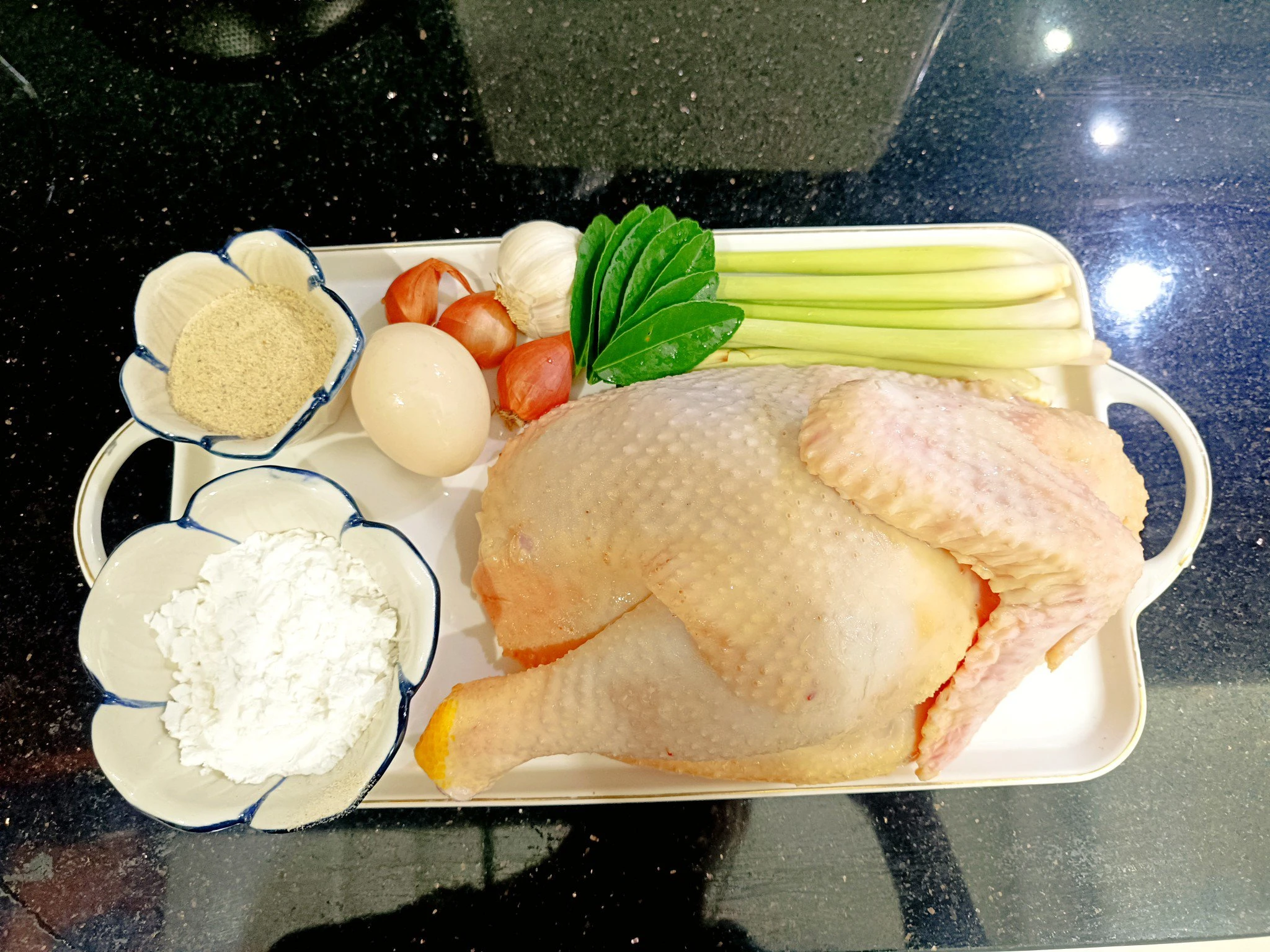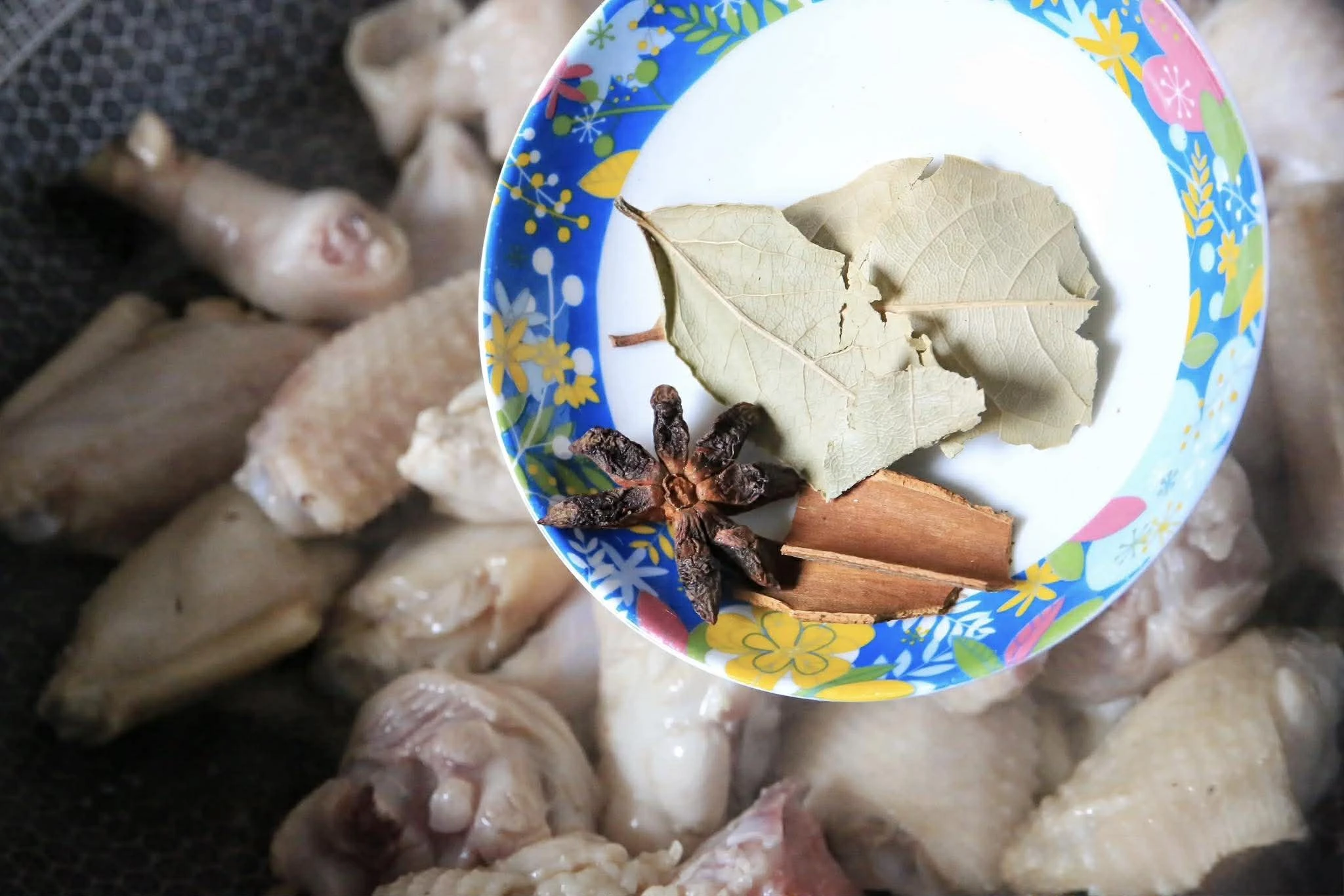 1/2 con gà tơ, 500g cánh gà, 1 nhánh gừng, 6 tép tỏi, 3 lá nguyệt quế, 2 thanh quế nhỏ, 1 cái hoa hồi, 3 muỗng canh nước tươngt, 1 muỗng canh nước tương đen, 1 muỗng canh sốt tương đậu ngọt.