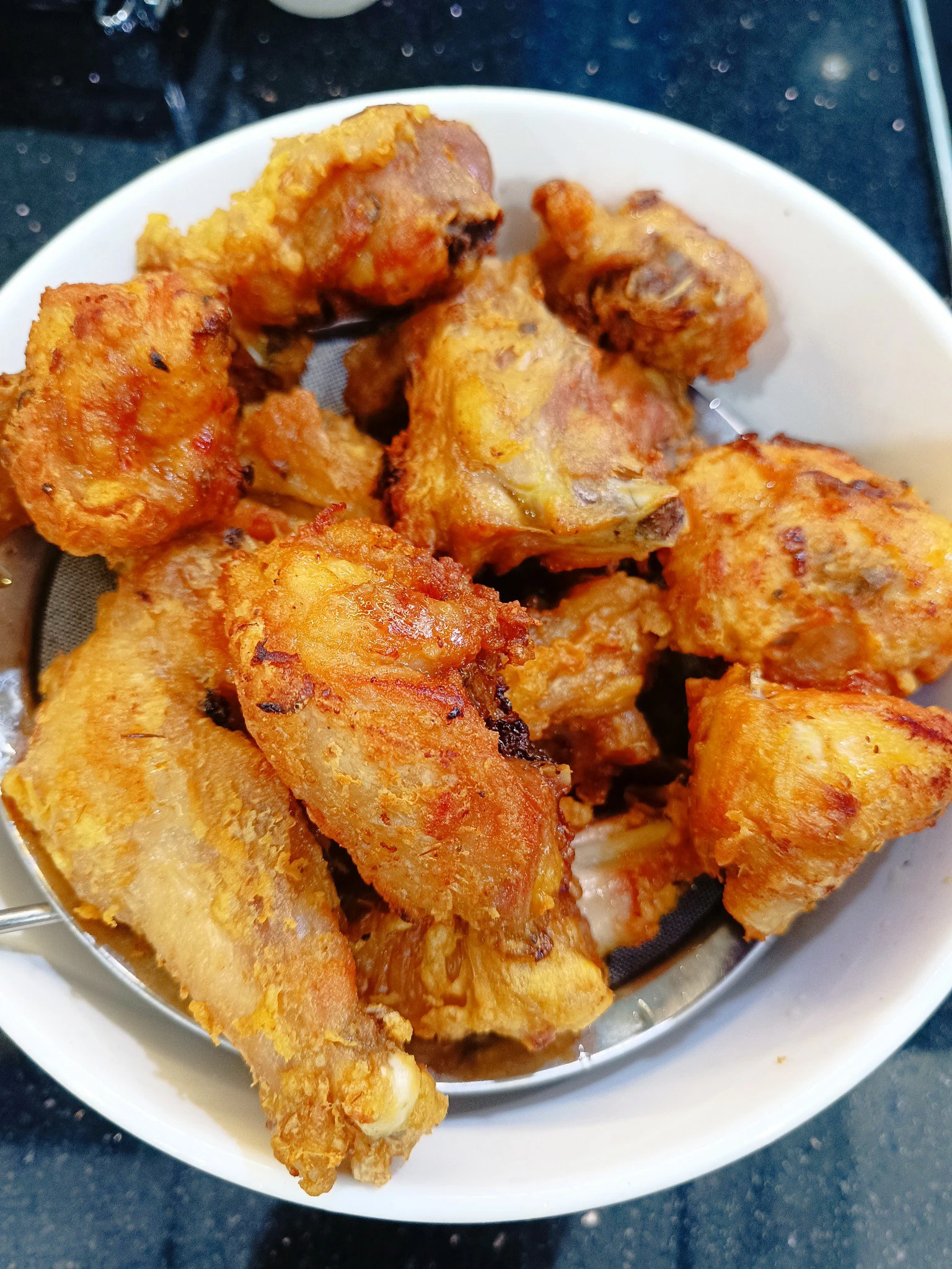 Chiên đến khi gà vàng giòn thì vớt ra, để ráo dầu.