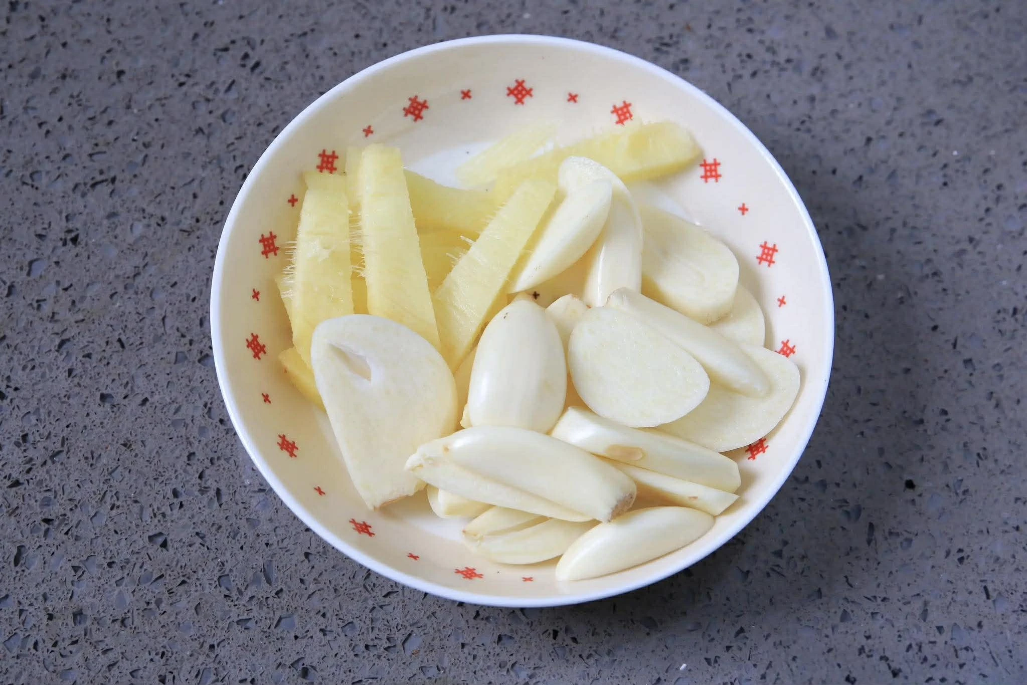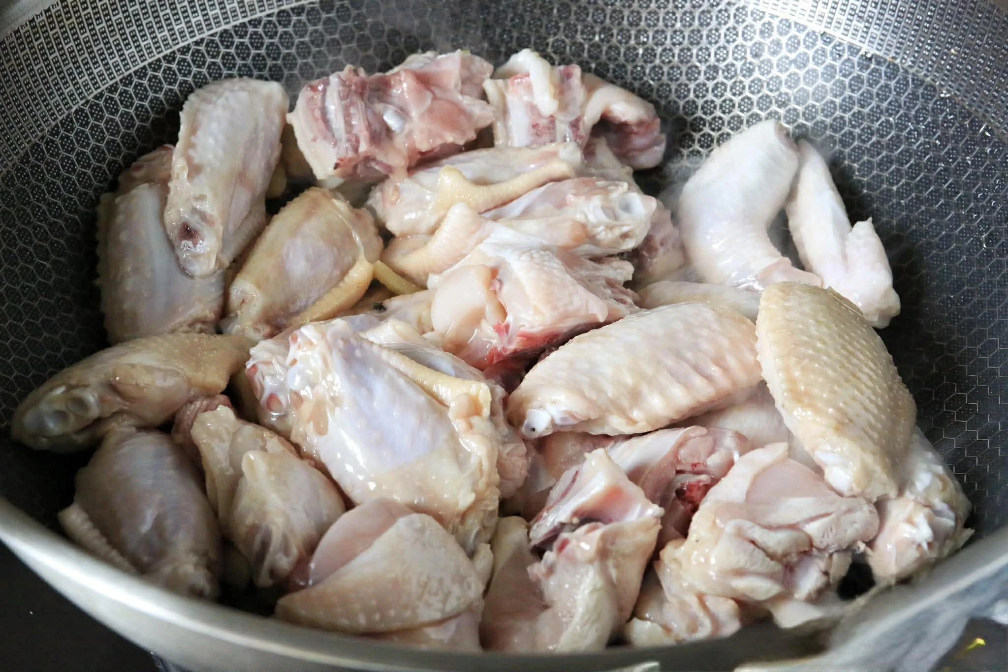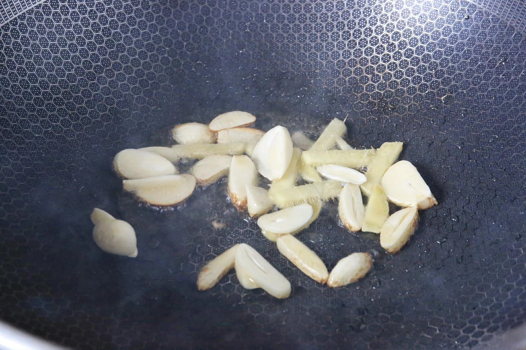Bước 1: Thịt gà và cánh gà sơ chế sạch, thấm khô nước. Sau đó chặt thịt gà và cánh gà ra thành các miếng vừa ăn. Gọt bỏ vỏ gừng, rửa sạch rồi thái sợi. Tỏi bóc bỏ vỏ, rửa sạch và thái lát. Tiếp theo, đun nóng dầu trong chảo, cho gừng và tỏi vào xào đến khi dậy mùi thơm.