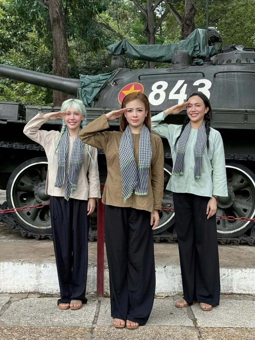 Hậu Hoàng, Dương Hoàng Yến và Diệu Nhi cùng nhau diện trang phục áo bà ba kèm khăn rằn, khoe bộ ảnh đặc biệt trong dịp kỷ niệm 50 năm Ngày Giải phóng miền Nam, thống nhất đất nước.