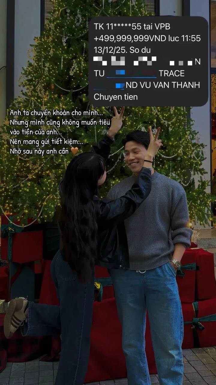 Mới đây, trên trang cá nhân, Trần Bích Hạnh - bạn gái của cầu thủ Vũ Văn Thanh đã đăng tải những khoảnh khắc đầy ngọt ngào của cặp đôi trong dịp cuối năm. Đáng chú ý nhất là ảnh chụp màn hình thông báo biến động số dư với con số "khủng": 499.999.999 VNĐ cùng nội dung chuyển khoản từ Vũ Văn Thanh.