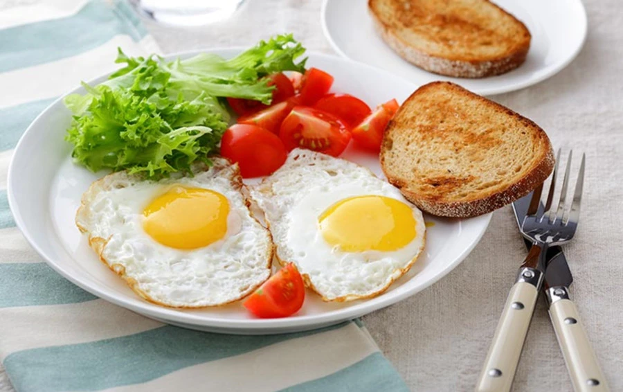 Bữa sáng nên đảm bảo hấp thụ protein chất lượng cao, ví dụ như trứng luộc, sữa, ức gà, thịt bò nạc, đậu phụ, cá và tôm. Nghiên cứu cho thấy việc tiêu thụ protein vừa phải giúp giảm cảm giác đói buổi sáng, khiến bữa trưa tự động giảm lượng calo nạp vào, giúp kiểm soát cân nặng.