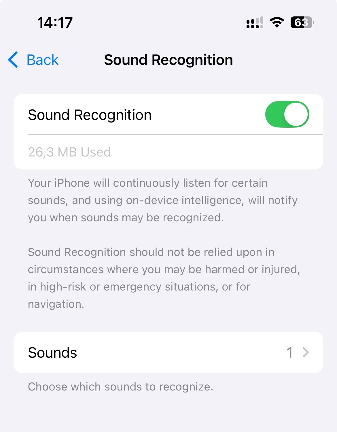 Vào Cài đặt (Settings) Trợ năng (Accessibility) Nhận biết âm thanh (Sound Recognition). Tại đây, bạn có thể chọn để iPhone lắng nghe và gửi thông báo khi phát hiện các âm thanh cụ thể như tiếng chuông cửa, báo cháy, tiếng trẻ em khóc, tiếng chó sủa hay tiếng thiết bị gia dụng phát âm thanh bíp.