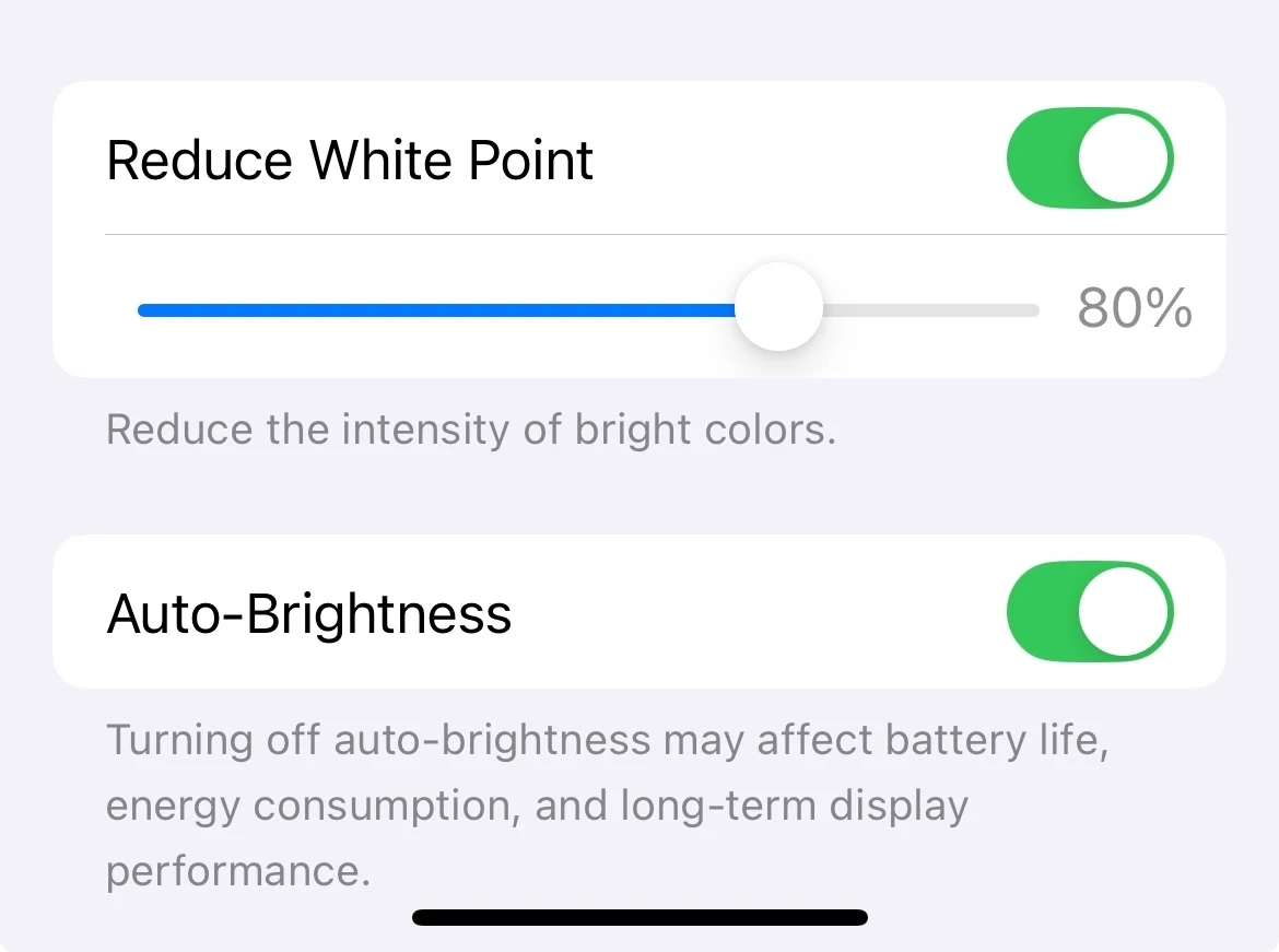 Để bật tính năng, bạn truy cập vào Cài đặt (Settings) Trợ năng (Accessibility) Màn hình & Cỡ chữ (Display & Text Size). Tìm và bật tùy chọn 'Giảm điểm trắng' (Reduce White Point). Bạn có thể điều chỉnh thanh trượt để màn hình tối hơn nữa, giúp làm dịu cường độ của các màu sáng và bảo vệ mắt tốt hơn.