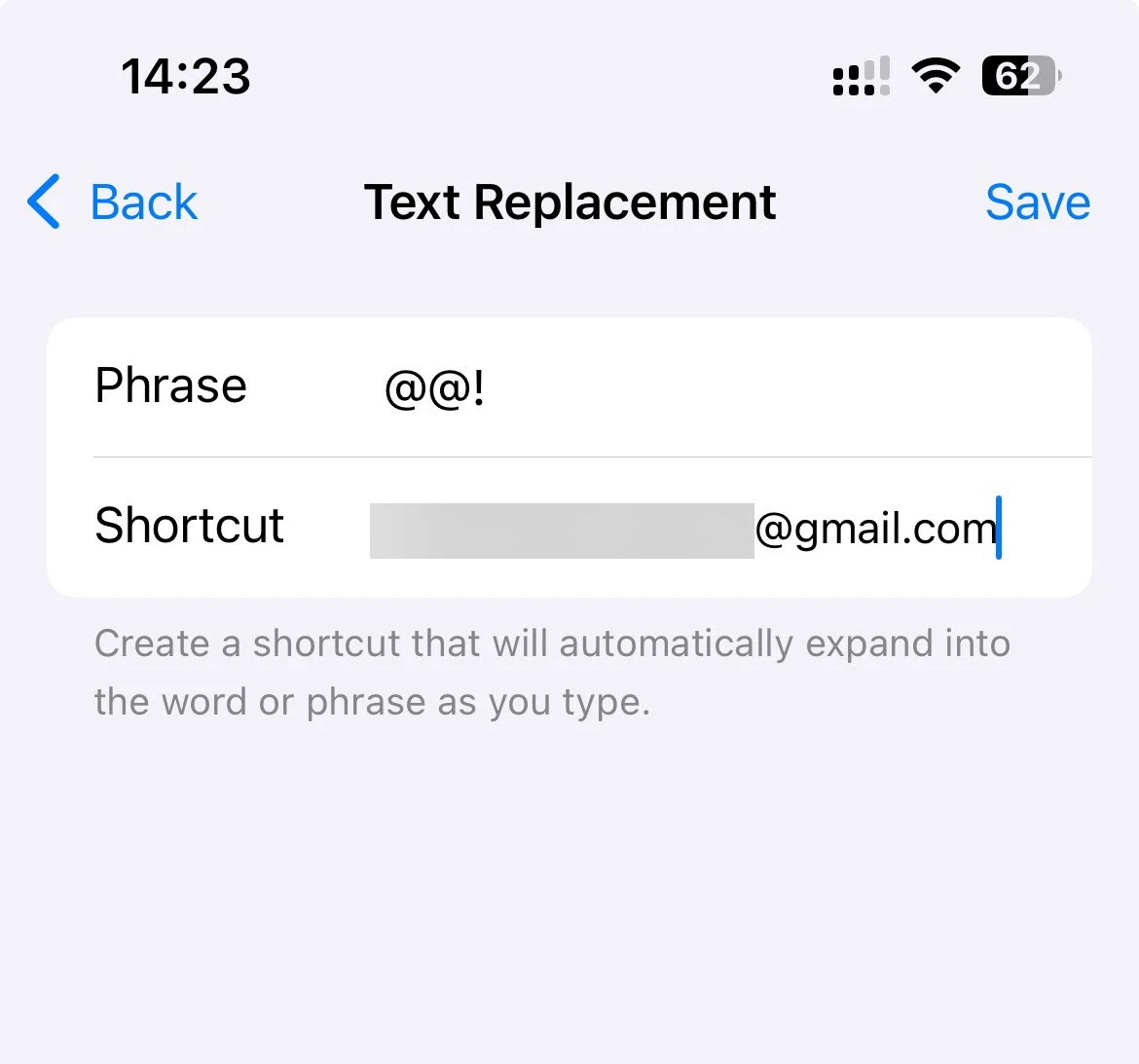 Mở Cài đặt (Settings) Cài đặt chung (General) Bàn phím (Keyboard) Thay thế văn bản (Text Replacement). Nhấn dấu cộng (), sau đó nhập cụm từ đầy đủ (ví dụ: địa chỉ email của bạn) và một phím tắt ngắn gọn (ví dụ: @@). Từ giờ, mỗi khi bạn gõ '@@', toàn bộ địa chỉ email sẽ tự động hiện ra.