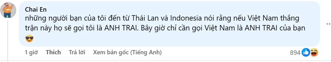 Tài khoản Chai En hào hứng chia sẻ câu chuyện thắng cược: "Những người bạn của tôi đến từ Thái Lan và Indonesia nói rằng nếu Việt Nam thắng, họ sẽ gọi tôi là anh trai.