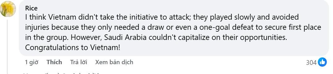 Trong khi đó, tài khoản Rice thừa nhận đã đánh giá thấp Việt Nam: "Tôi nghĩ họ chỉ chơi chậm để giữ ngôi đầu bảng, nhưng Ả Rập Xê Út hoàn toàn bất lực. Chúc mừng Việt Nam."