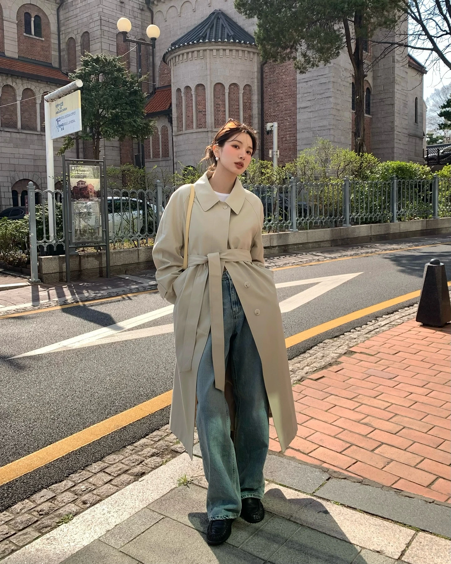 Để trẻ trung hơn, chị em nên tránh trench coat quá rộng hoặc quá dài. Khi phối đồ, có thể kết hợp trench coat với quần jeans ống suông, chân váy xẻ tà hoặc váy liền dáng đơn giản. Chỉ cần khoác nhẹ trench coat bên ngoài là tổng thể outfit đã trở nên chỉn chu, thời trang mà vẫn giữ được sự tươi mới, phù hợp với không khí mùa xuân.