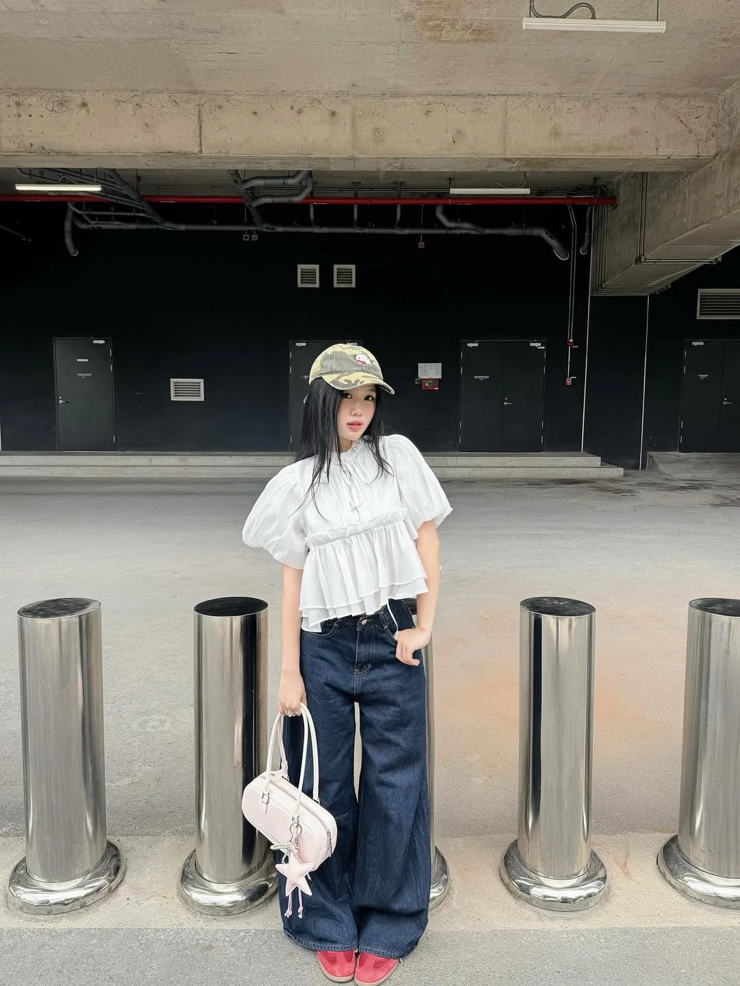 Với những buổi xuống phố thong thả, áo babydoll trắng tay phồng là lựa chọn dễ mặc và dễ phối. Phần thân áo xếp tầng, trong khi cổ chữ V nhẹ nhàng làm giảm cảm giác bí bách ở phần thân trên. Khi kết hợp cùng quần jeans ống rộng sáng màu, mang hơi thở tự do và phóng khoáng