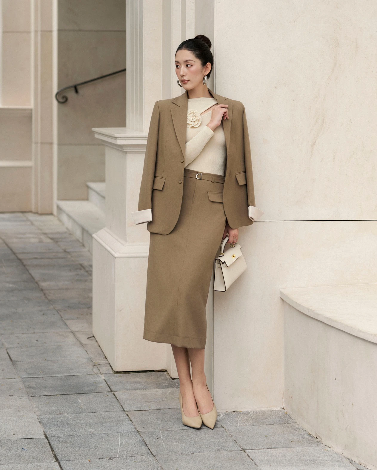 Trắng kem và nâu đất hài hòa, dịu dàng và nữ tính trong bản phối dành cho nàng công sở . ẢNH: L'ALLÉE