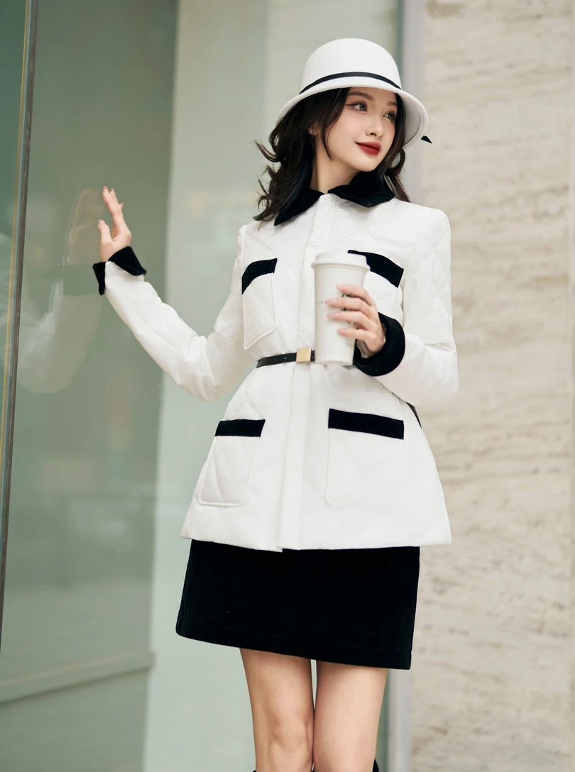 Sự hòa quyện của các gam màu trắng và đen làm nên những bản phối tối giản đẹp cuốn hút. Áo vest cách điệu với phần thân crop và tay đính lông vũ diện cùng quần kẻ sọc cạp cao; áo khoác dài chần bông màu đen trắng phối cùng chân váy mini và bốt cao chạm gối đầy cá tính
