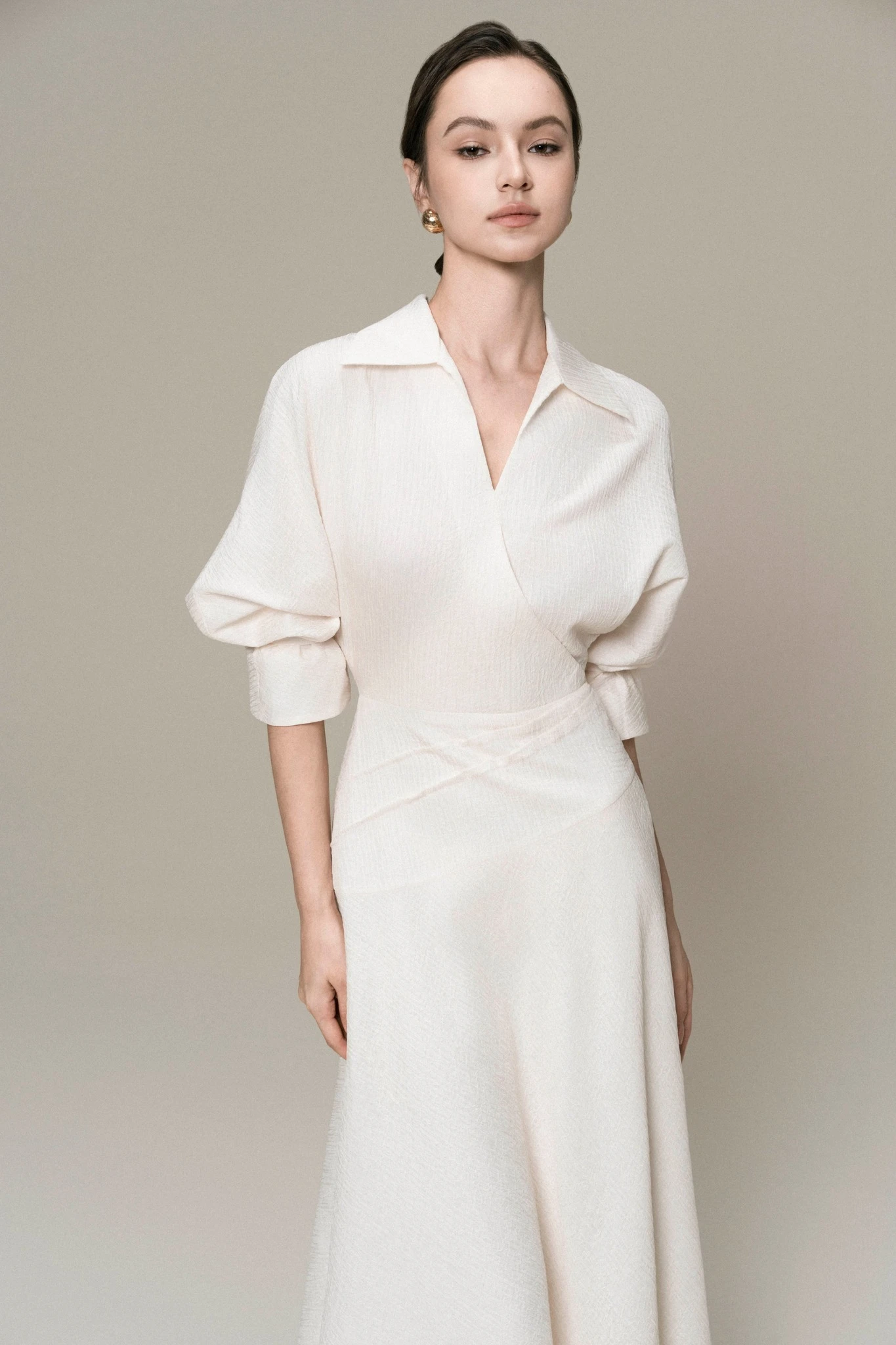 Sức hút từ mẫu váy dài màu cream nằm ở sự kỳ công qua việc cắt vải xéo, đường xếp nếp mềm mại nơi eo tạo độ xòe tự nhiên cho trang phục. Một chiếc váy midi cổ chữ V với phần cổ áo bẻ nửa sau vừa đủ chuyên nghiệp, lịch thiệp mà vẫn đầy quyến rũ