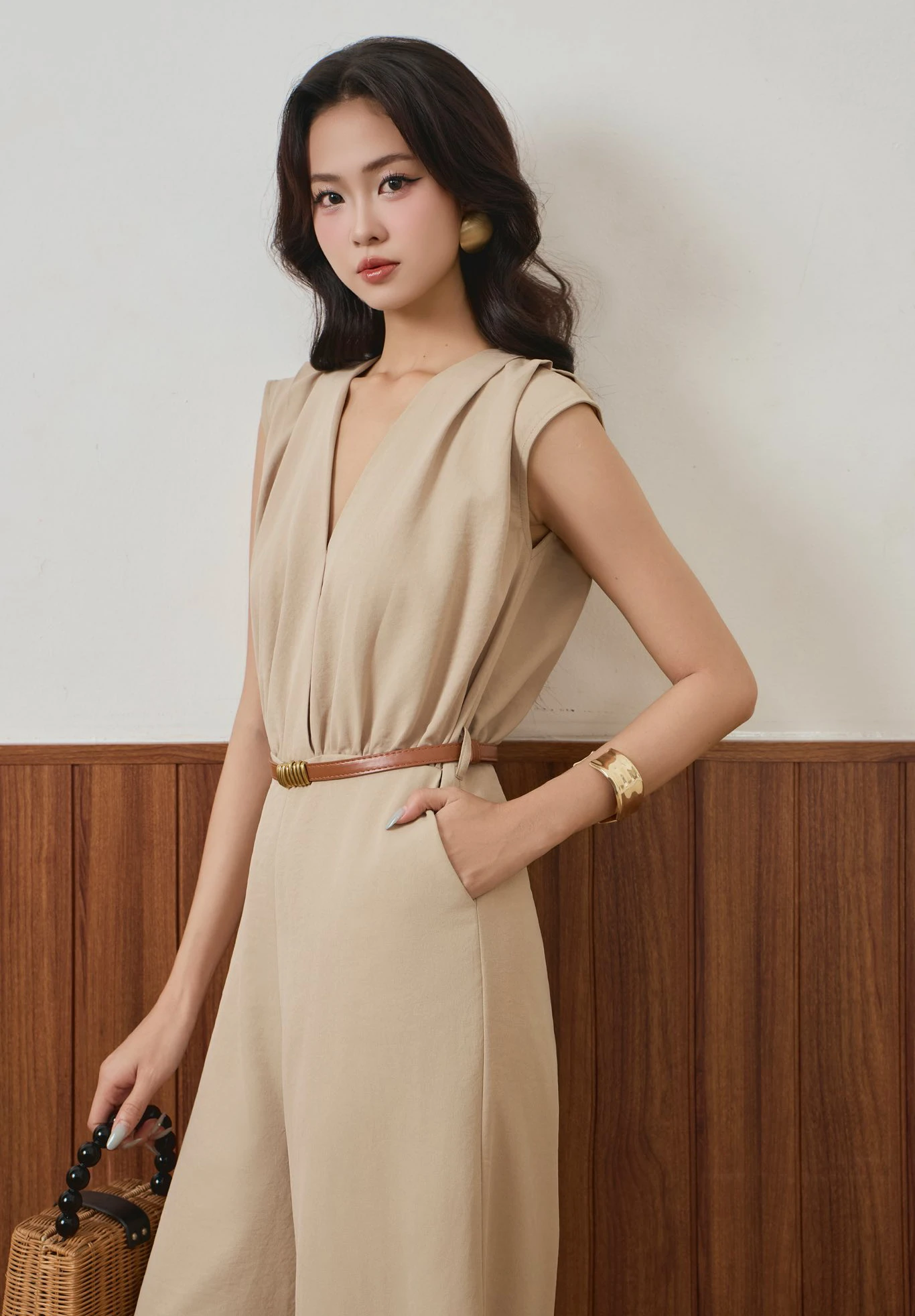 Jumpsuit màu beige hướng đến hình ảnh thanh lịch cổ điển qua việc tinh giản hầu hết các chi tiết trang trí và chỉ tập trung vào những đường cắt sáng tạo nhằm tạo ra hình ảnh chỉn chu, hoàn hảo với mọi vóc dáng