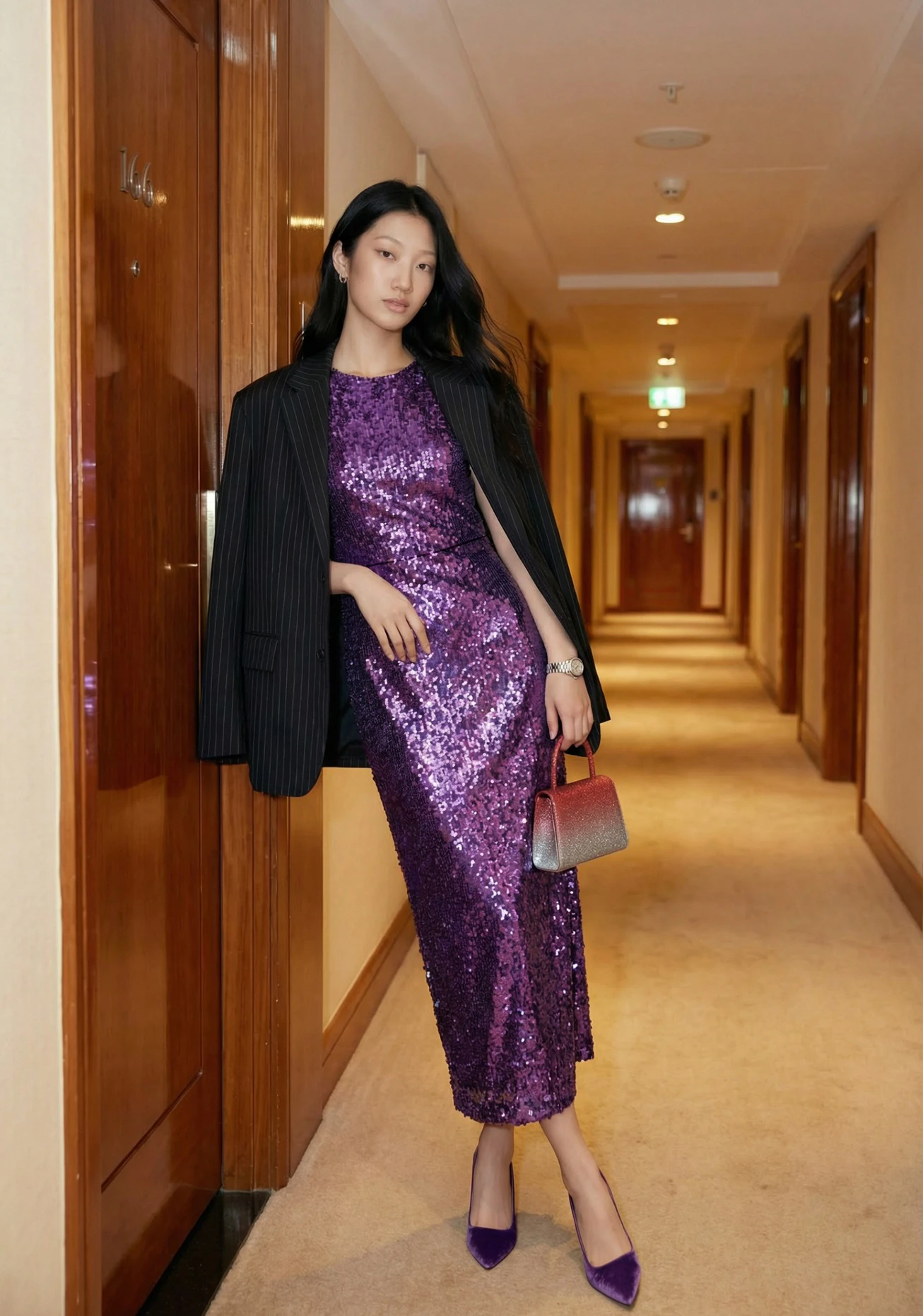 Sự kết hợp thú vị của tím và đen, họa tiết kẻ sọc dọc mang tinh thần của các bộ trang phục menswear và thiết kế đầm sequin tím lãng mạn đi cùng mẫu túi loang màu ấn tượng