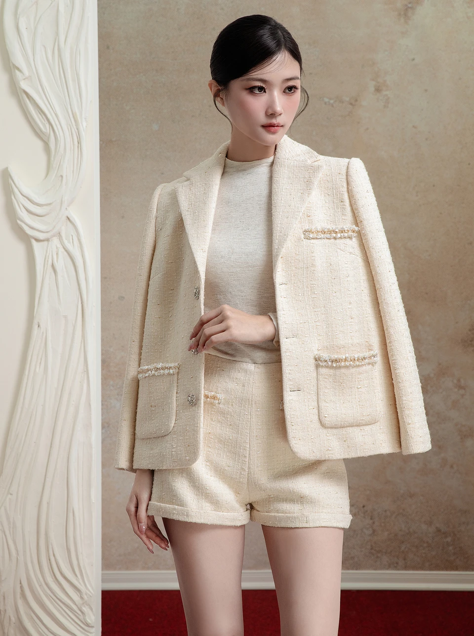 Áo blazer tạo nên điểm nhấn thị giác cho bản phối dự tiệc sang chảnh, kiêu kỳ mà nàng diện cho một sự kiện trọng đại dịp đầu năm. ẢNH: ANMIER