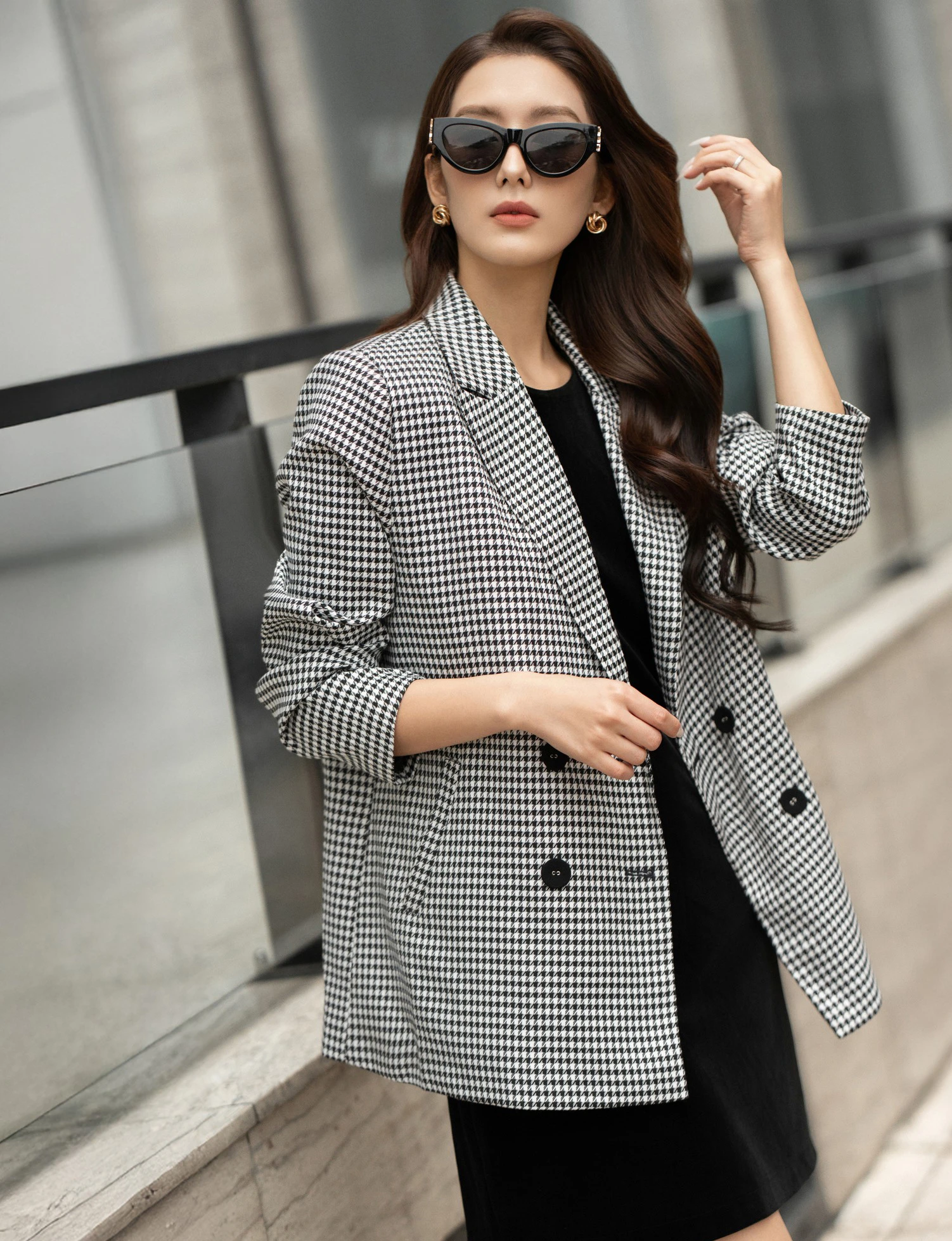 Blazer họa tiết nanh sói trắng đen giúp thiết kế váy đen trở nên nổi bật và ấn tượng hơn. Không chỉ hợp với váy đen, kiểu áo khoác này còn có thể phối với nhiều bản phối họa tiết và màu sắc khác