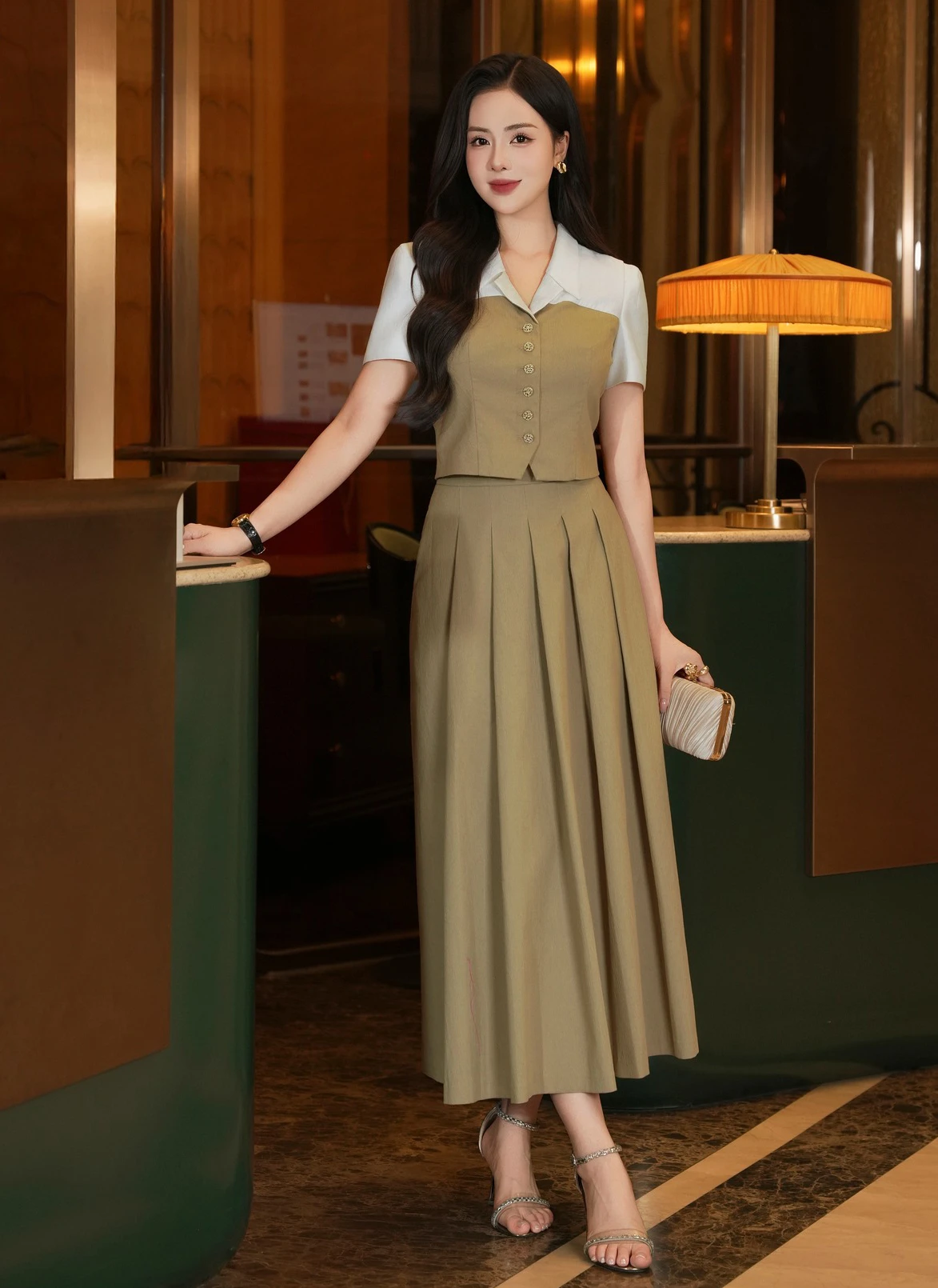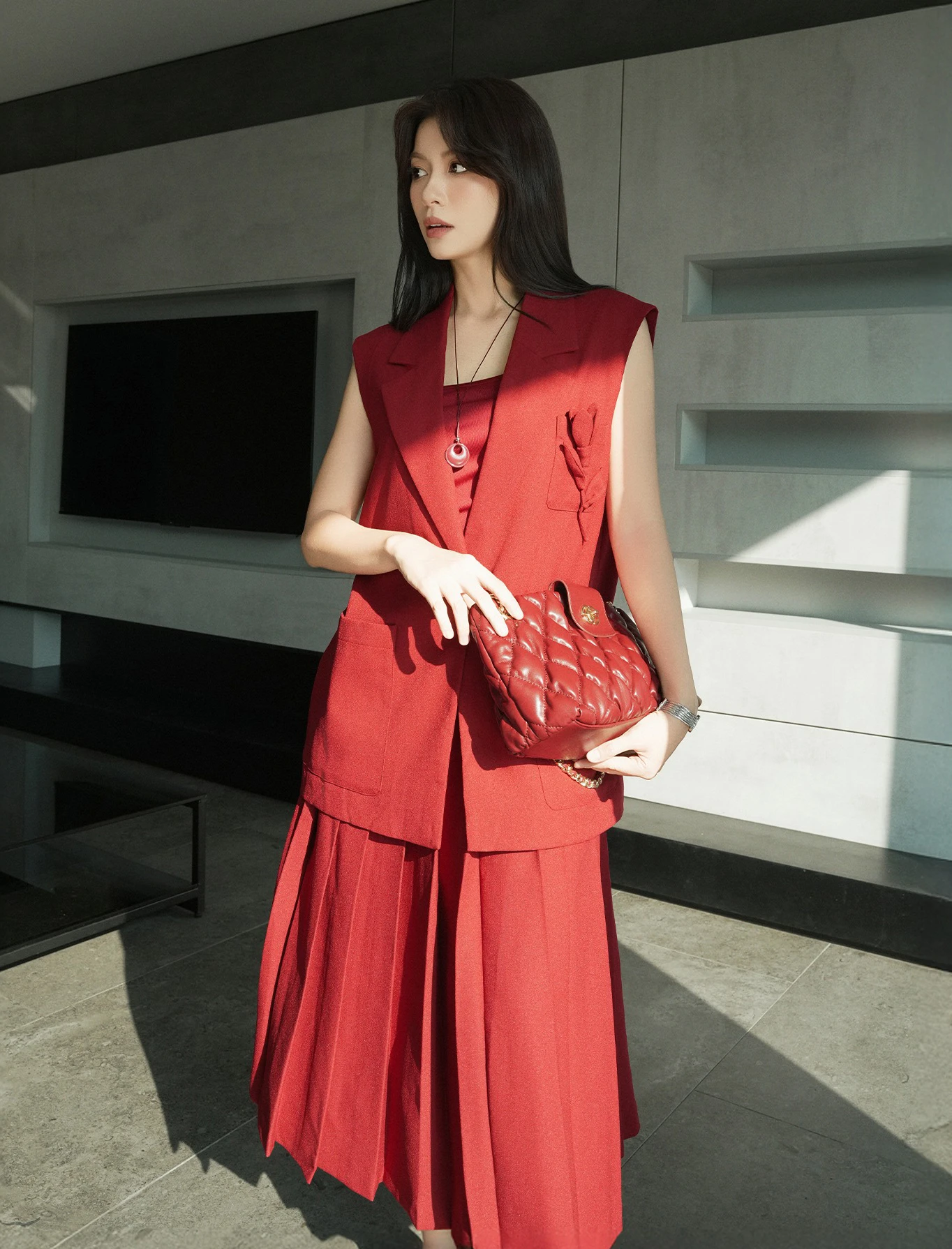 Sắc đỏ nổi bật, rạng rỡ và tràn đầy sức sống từ bản phối tone sur tone của chân váy xếp ly dáng midi, áo blazer không tay và áo hai dây/ áo cúp ngực cùng tông màu