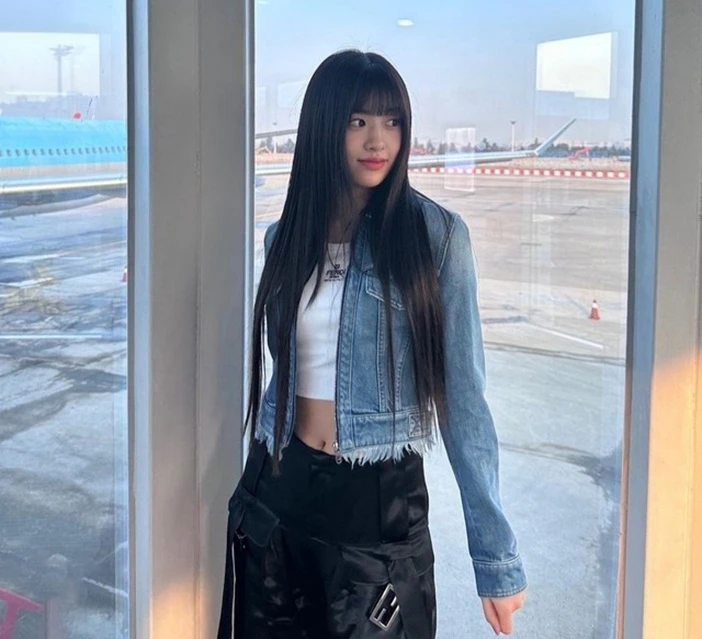 Yu Jin diện áo khoác jean dáng ngắn tông xanh nhạt với áo crop top trắng đơn giản bên trong, nữ idol lựa chọn quần túi hộp dáng oversized, giúp tổng thể trở nên cá tính, đồng thời làm nổi bật vòng 2 thon gọn và đôi chân dài đáng ngưỡng mộ.