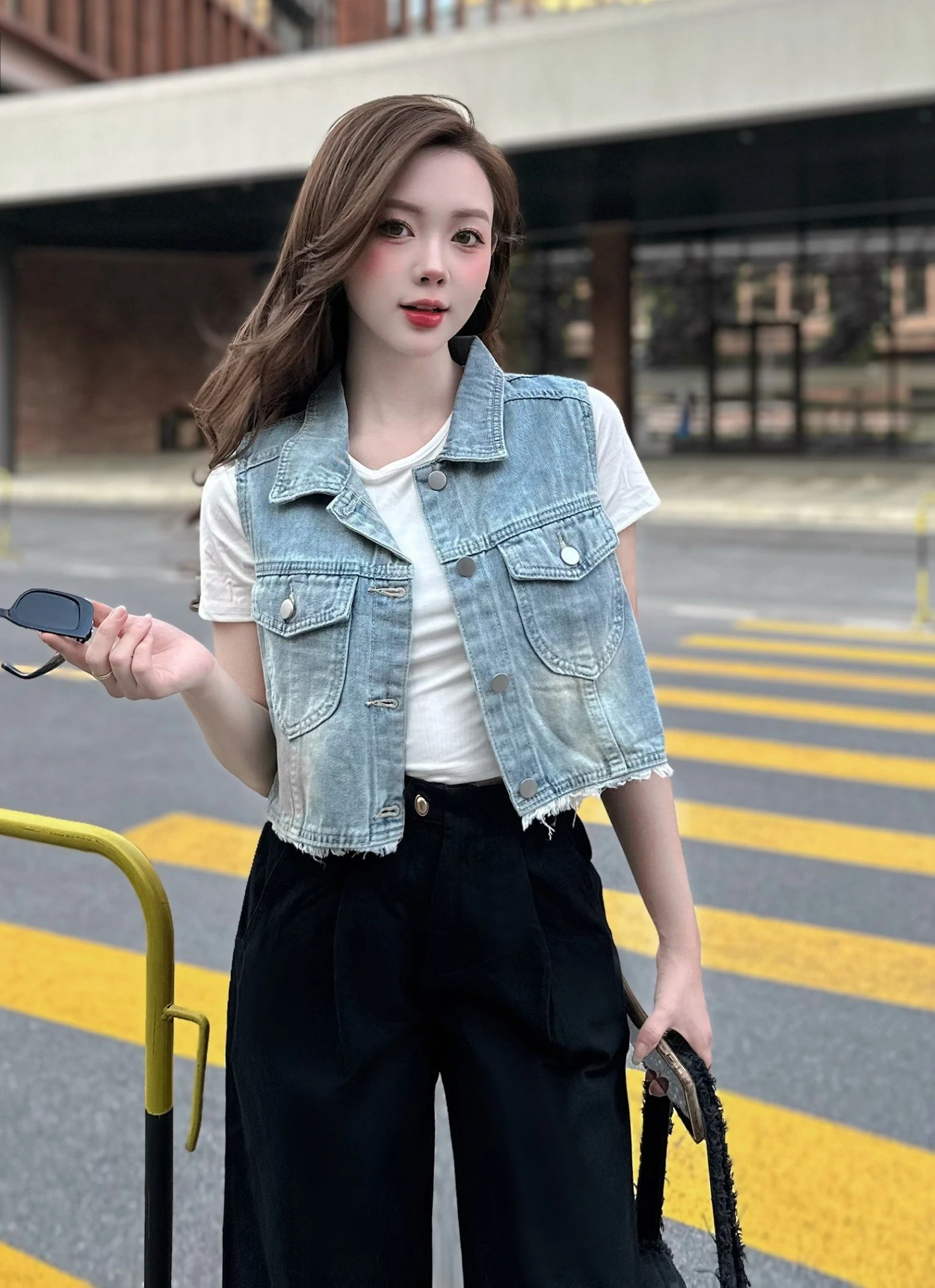 Một gợi ý dễ ứng dụng là áo khoác gile jean tông xanh nhạt kết hợp áo phông trắng bên trong. Khi được sơ vin gọn gàng cùng quần tây ống suông, tổng thể trở nên thanh lịch nhưng vẫn toát lên nét cá tính khó trộn lẫn. Túi tote đen và kính râm sẽ là bộ đôi không thể thiếu để hoàn thiện phong cách tối giản, phù hợp cho cả đi chơi lẫn đi làm.